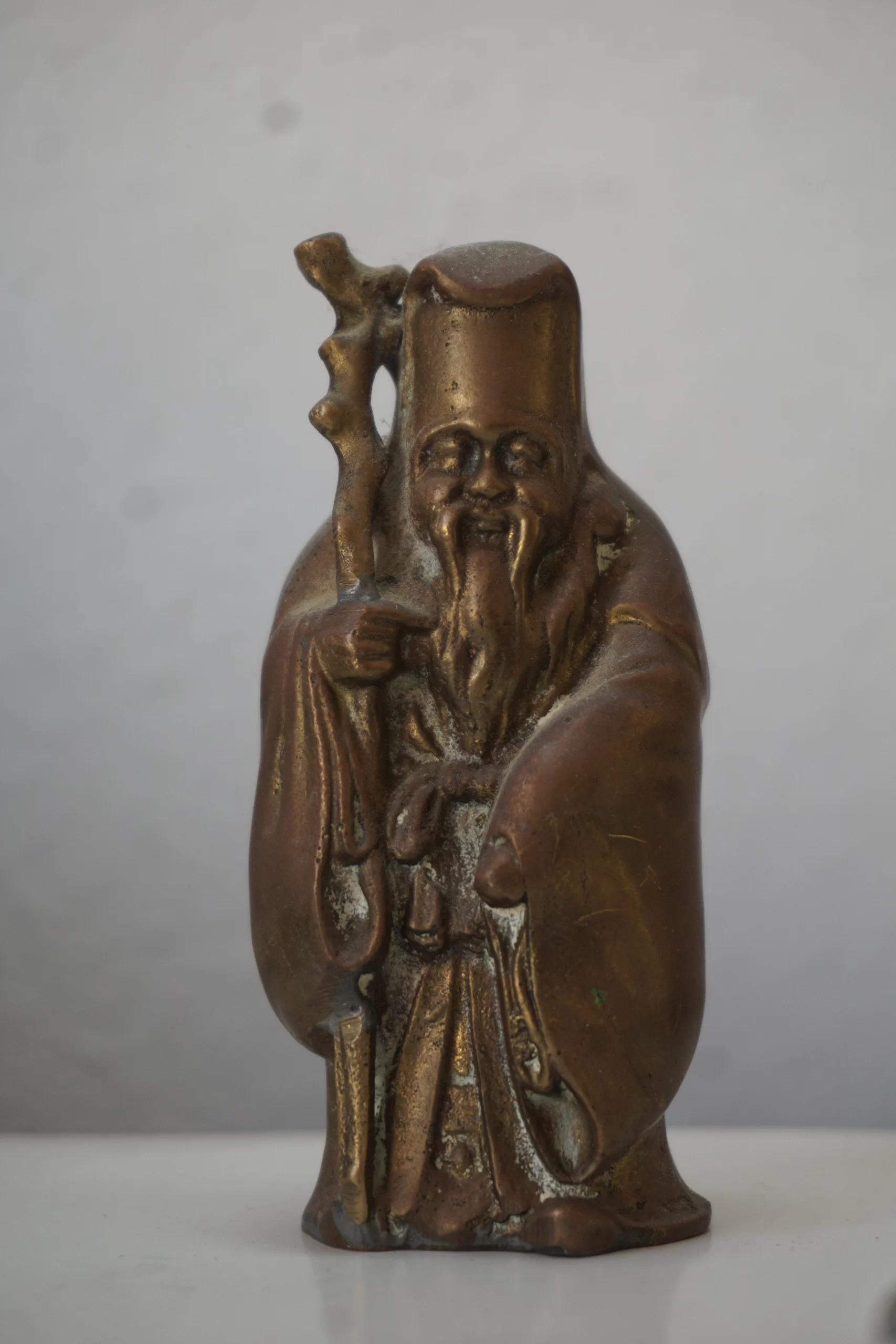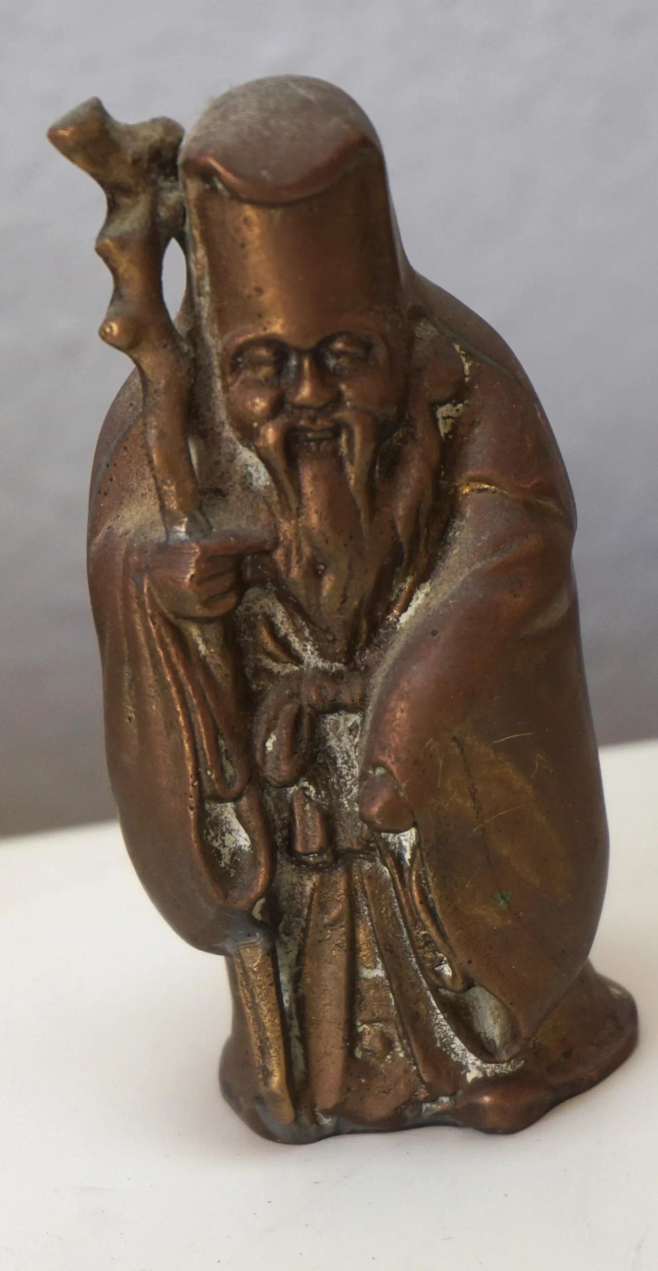 This finely cast bronze figure represents Shou Lao (Shou Xing), the revered Chinese God of Longevity from Taoist tradition. Characterized by his tall forehead, flowing beard, and benevolent smile, Shou Lao is shown holding a staff with a gnarled branch, symbolizing support through a long life, and a scroll representing wisdom. The figure displays a beautiful aged bronze patina, with natural wear highlighting its age and use. Compact in size, this 10 cm sculpture was likely part of a scholar’s desk collection or a household altar, serving as a blessing for health, wisdom, and long life.Material: BronzeOrigin: ChinaPeriod: Likely early 20th century Shou Lao is one of the Three Star Gods (Fu, Lu, Shou) in Chinese mythology and remains a popular figure in art and talismans. This piece is a charming addition for collectors of Asian antiques, bronze figures, or those interested in Chinese symbolism and mythology.