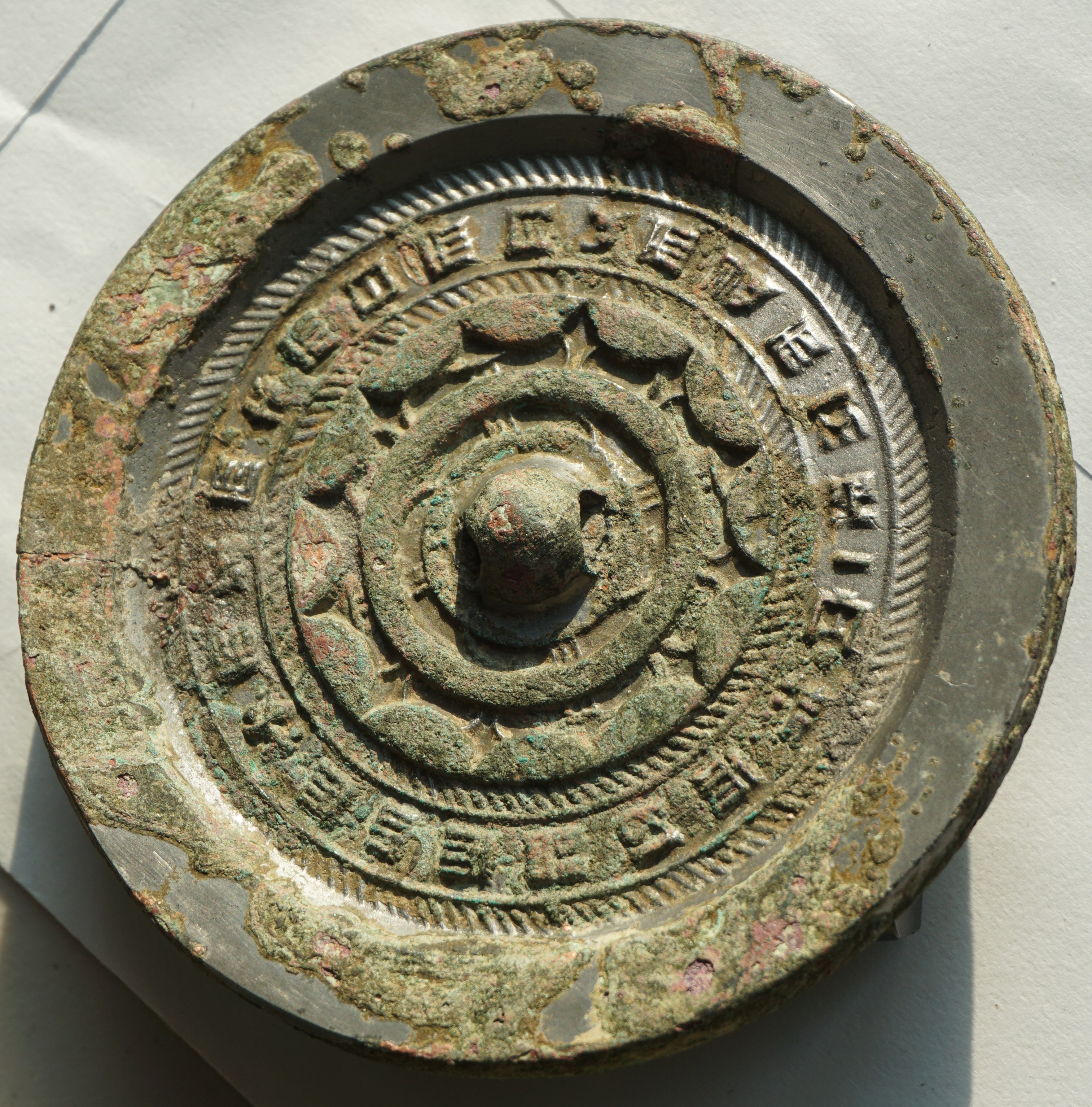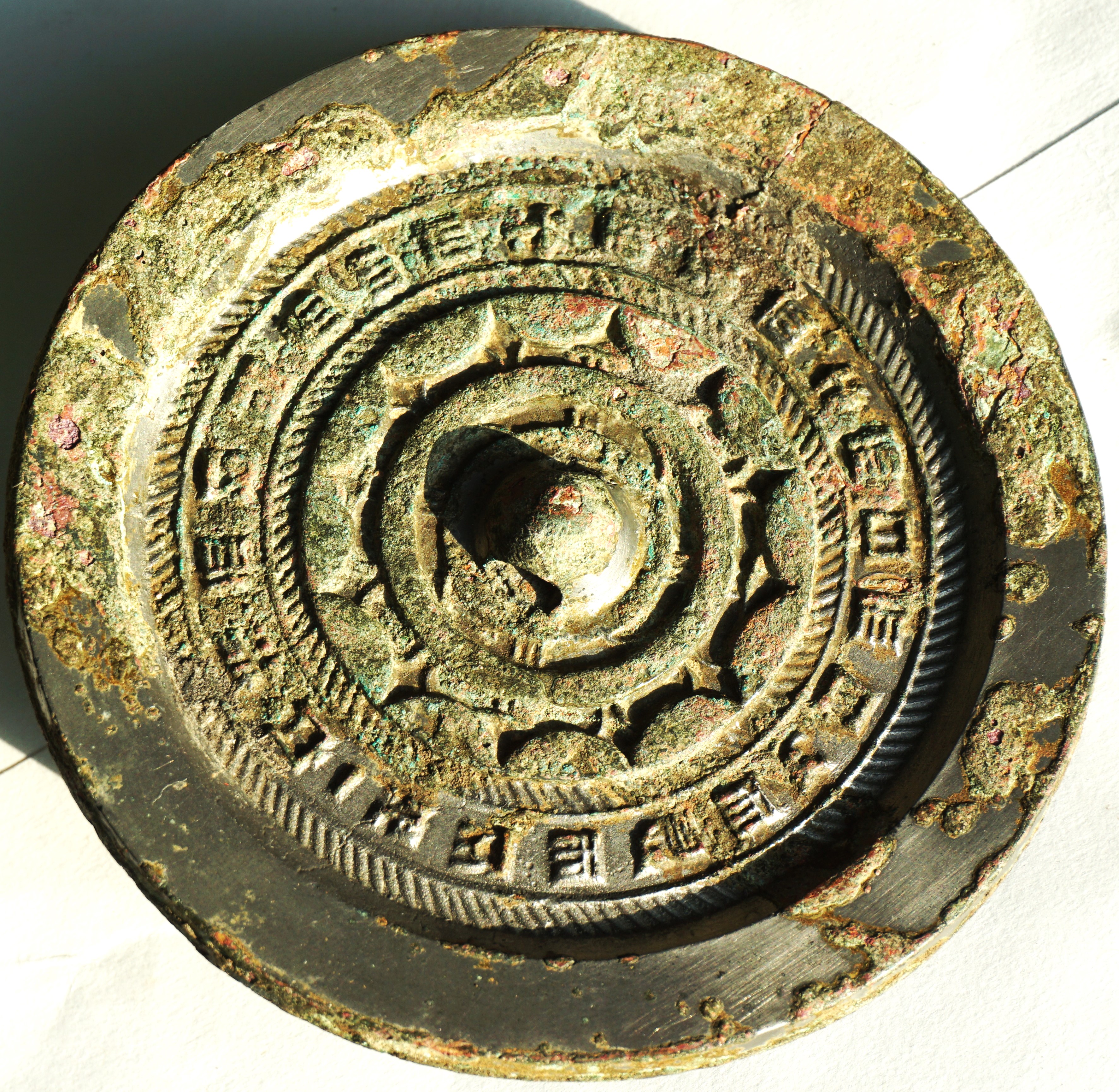 The inscription in Classical Chinese follows the typical style of inscriptions found on ancient Chinese bronze mirrors. Many of these inscriptions contain auspicious phrases, references to craftsmanship, or poetic expressions. Approximate Transcription (Traditional Chinese) The characters appear to follow a structure commonly seen on Han dynasty mirrors. A possible transcription could be: 「長宜子孫 百福并臻」 Translation:「長宜子孫」 – "May it bring long-lasting prosperity to descendants." 「百福并臻」 – "May a hundred blessings come together." Interpretation: These inscriptions typically convey good fortune, longevity, and prosperity, which were common themes in Chinese mirror inscriptions, especially during the Han Dynasty (206 BCE – 220 CE). The phrase expresses a wish for wealth, happiness, and many generations of successful offspring, reflecting Confucian values and the cultural importance of family legacy.