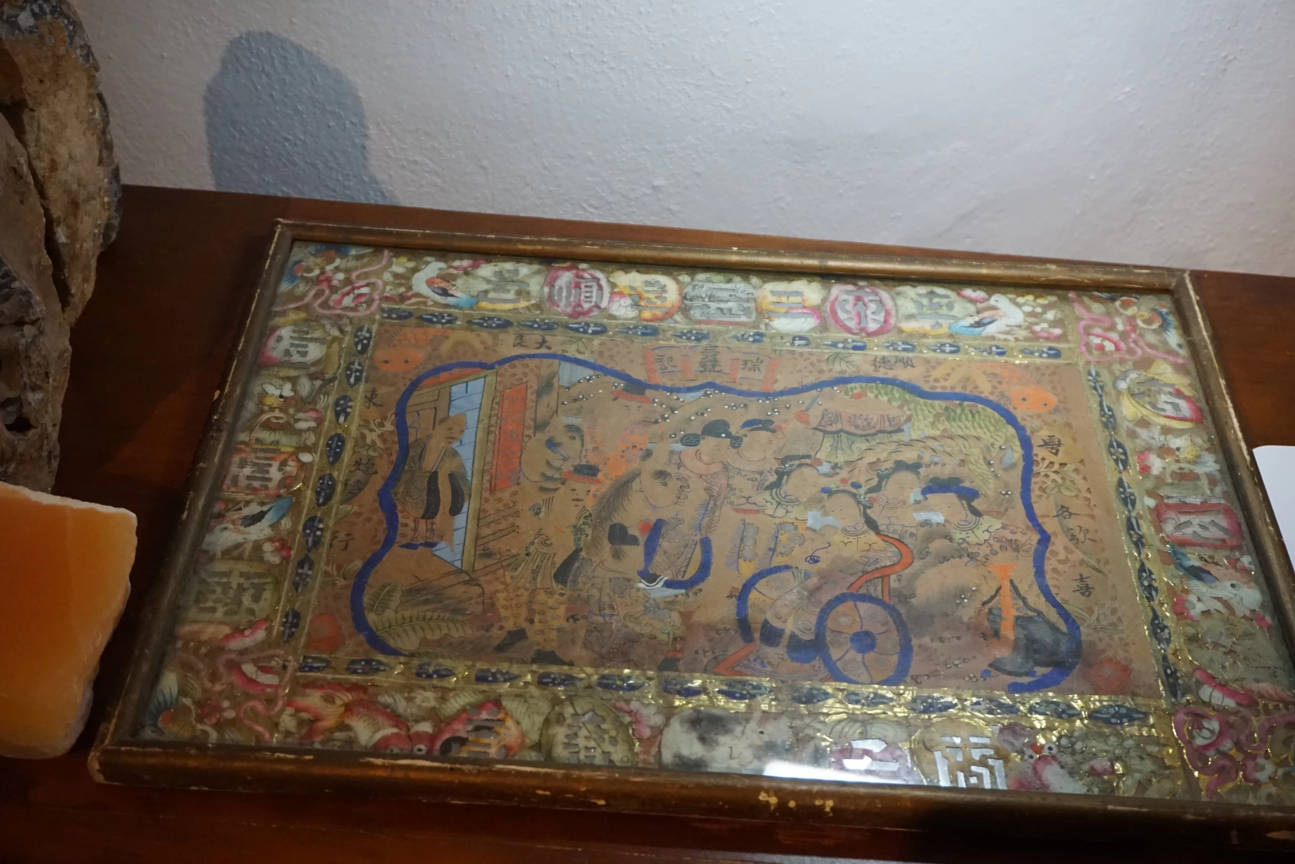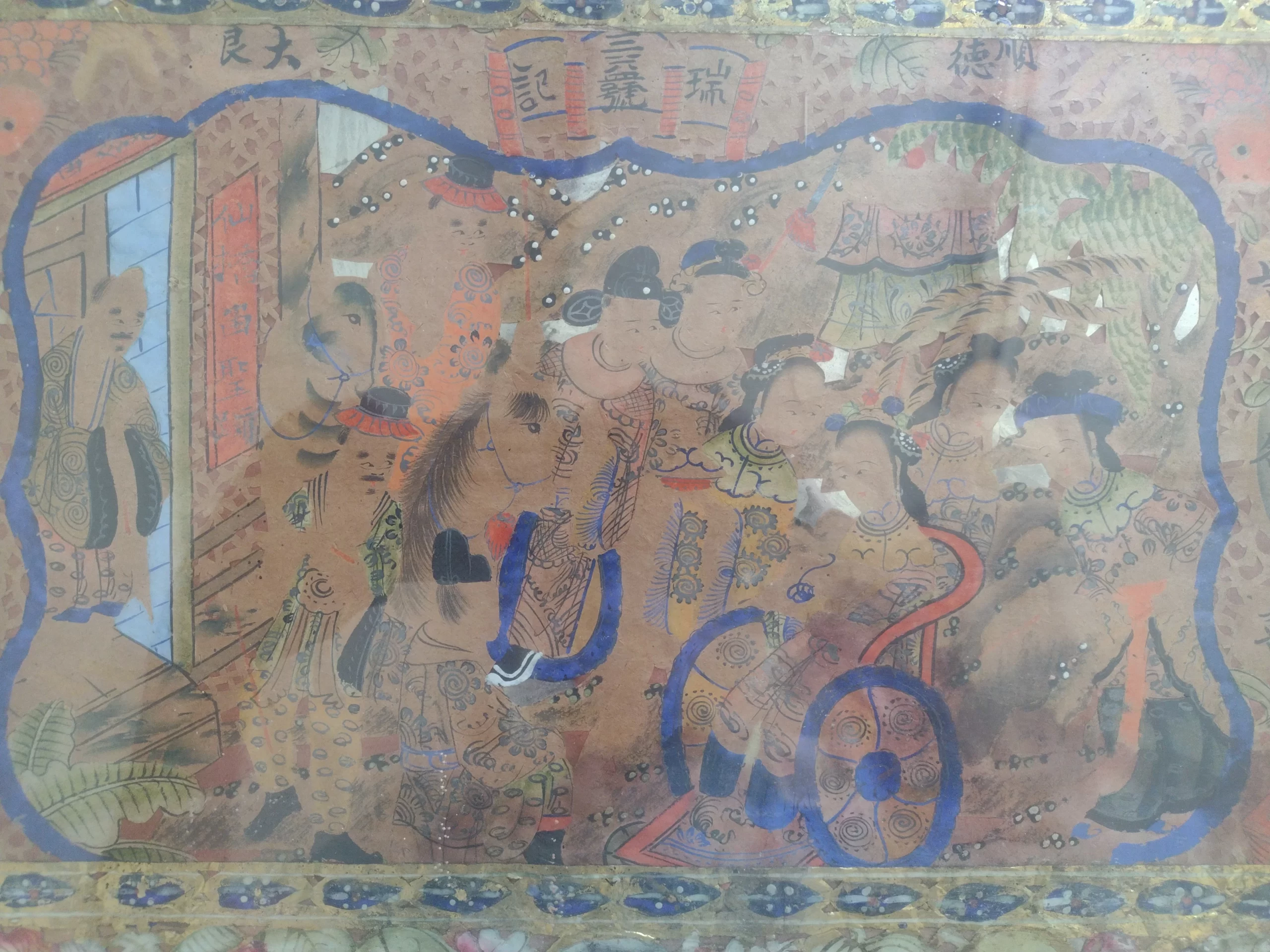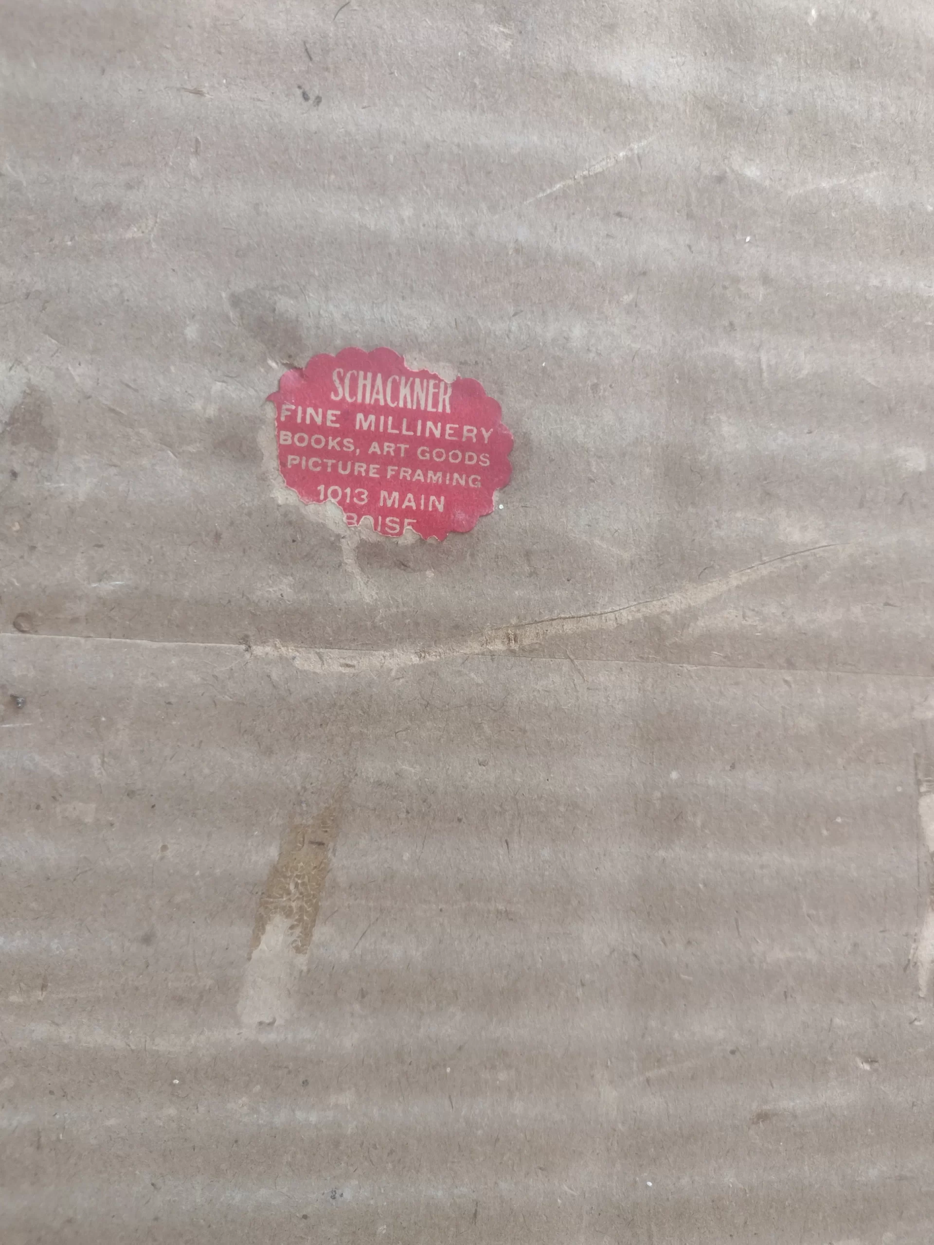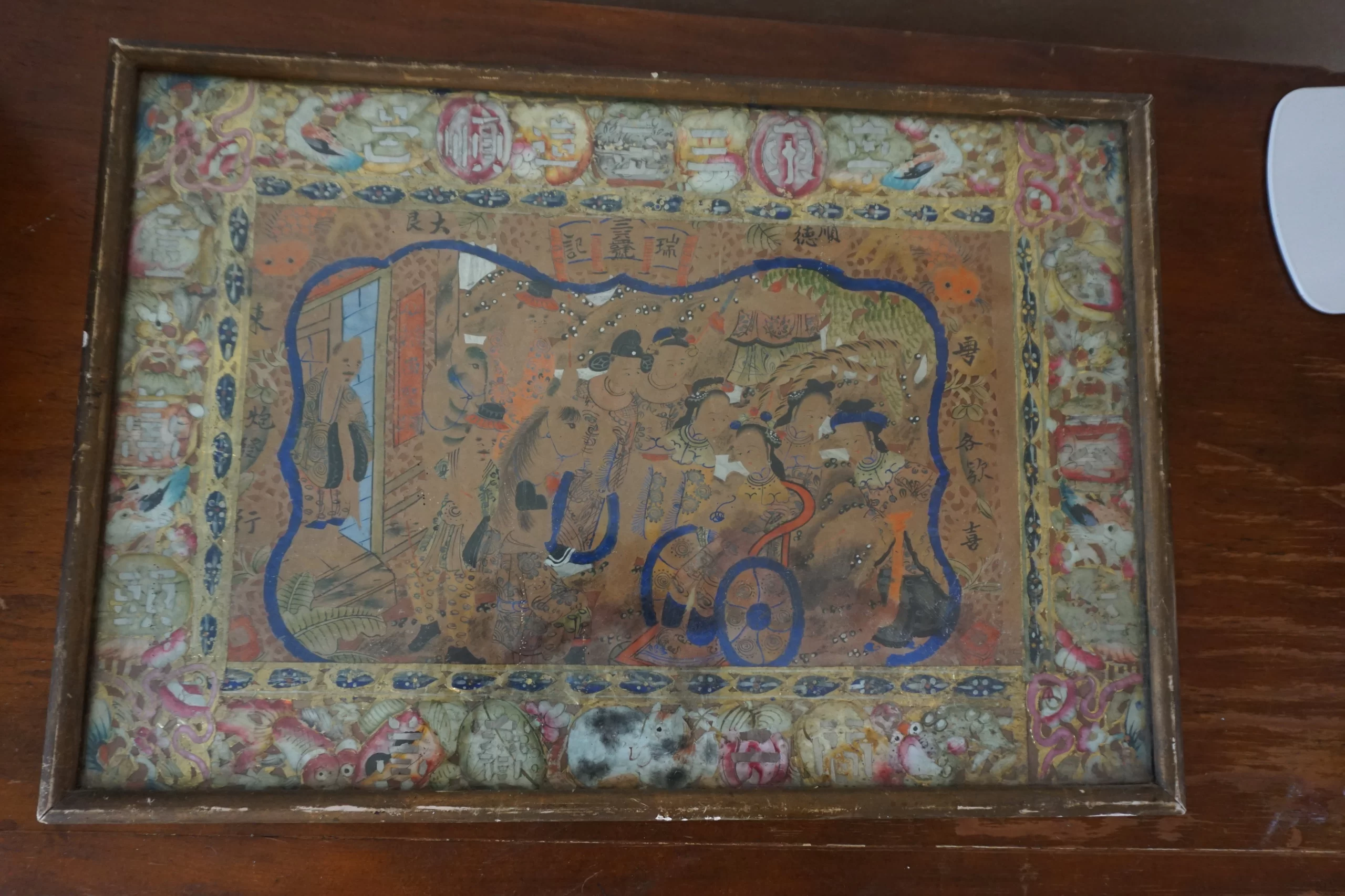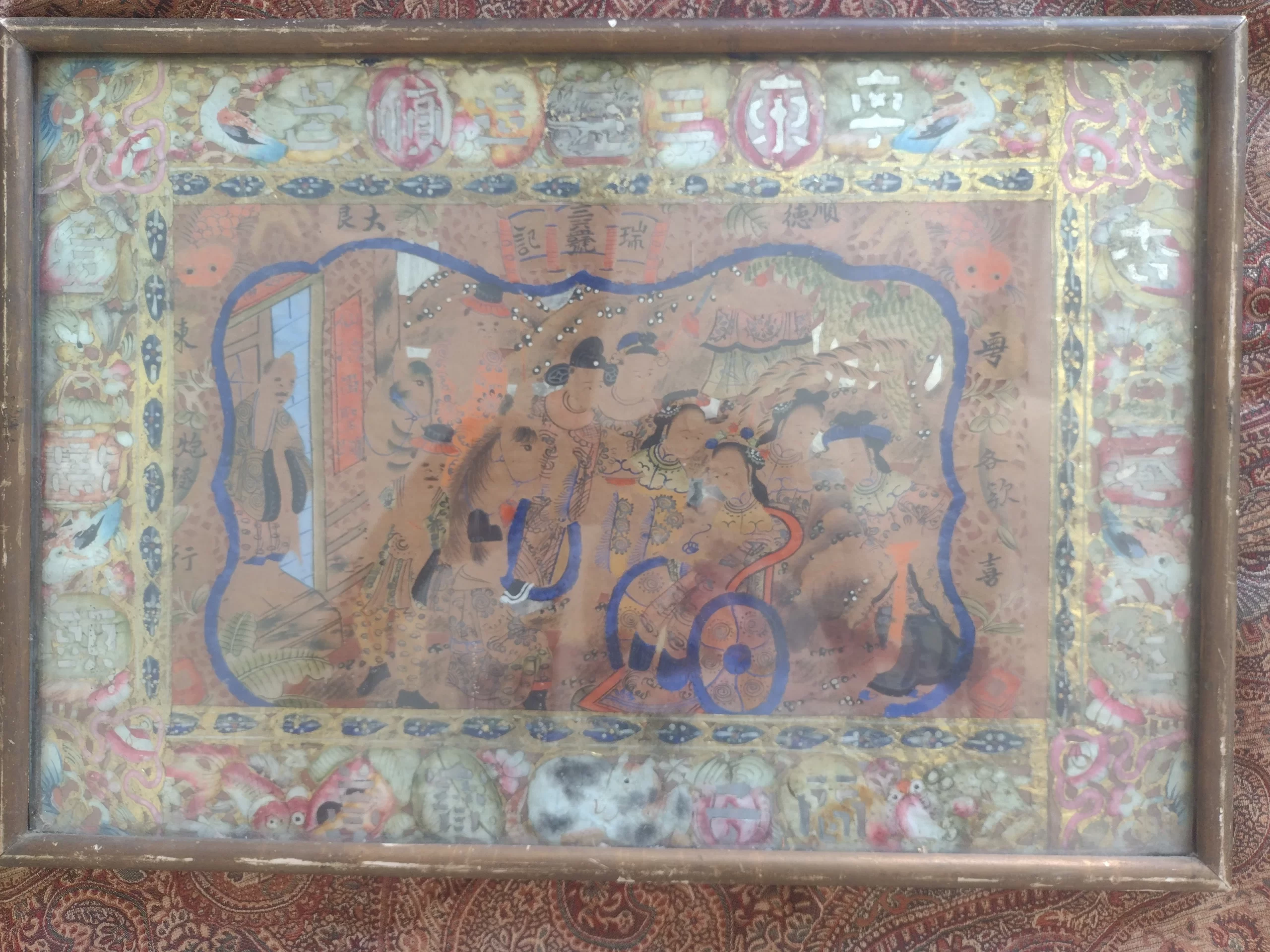 This unique hybrid composition combines a hand-painted central funerary scene with a richly decorated collaged border of cut paper and gold foil elements. The central image portrays a young child seated in a ceremonial cart or wheelchair, surrounded by attendants or family figures, rendered with care and ceremonial dignity. This figure appears to be the focal point of a spirit escort procession, a traditional concept in Chinese funerary customs where the deceased is guided toward the afterlife. The imagery strongly suggests a memorial offering for a deceased child, possibly created for a funeral or ancestral altar. In Chinese folk belief, children who pass away before adulthood require special attention in ritual to ensure their soul’s peace and proper reincarnation. The presence of the cart — likely not a literal wheelchair, but a symbolic vehicle for transition — paired with attendants, is consistent with the iconography of a spirit journey or ceremonial guidance. The surrounding border, created with intricate collage techniques using printed and hand-colored motifs, includes auspicious symbols such as birds, fish, dragons, lotus flowers, and blessing characters like Longevity (壽) and Fortune (福). Above the painted scene, a banner reads 瑞義堂 (Hall of Auspicious Righteousness), suggesting the artwork was dedicated in the name of a family hall rather than to an individual by name. What makes this piece especially rare is its preservation. While most zhǐ zhā (紙紮) — ritual paper offerings — were intended to be burned after use, this example was instead framed in Boise, Idaho by Schackner Fine Millinery between 1920 and 1945. The presence of the shop label confirms its early export and careful preservation. This is a rare and moving example of ephemeral Chinese folk art surviving through trans-Pacific migration, early American framing, and over a century of private care.