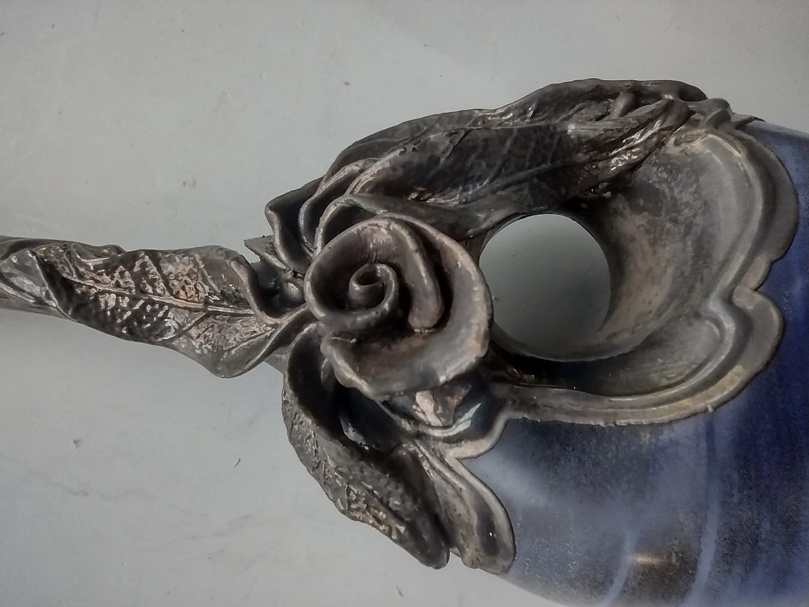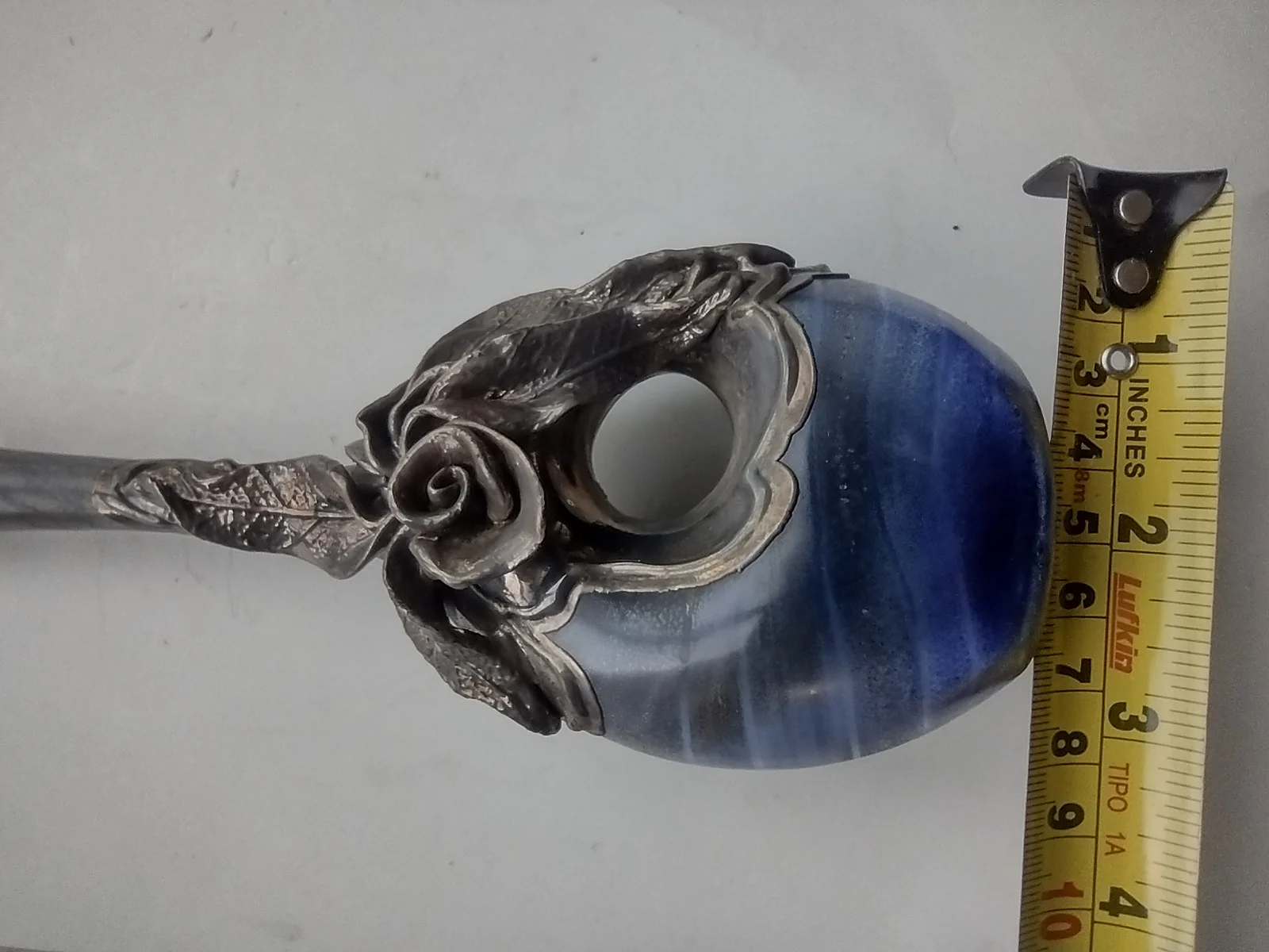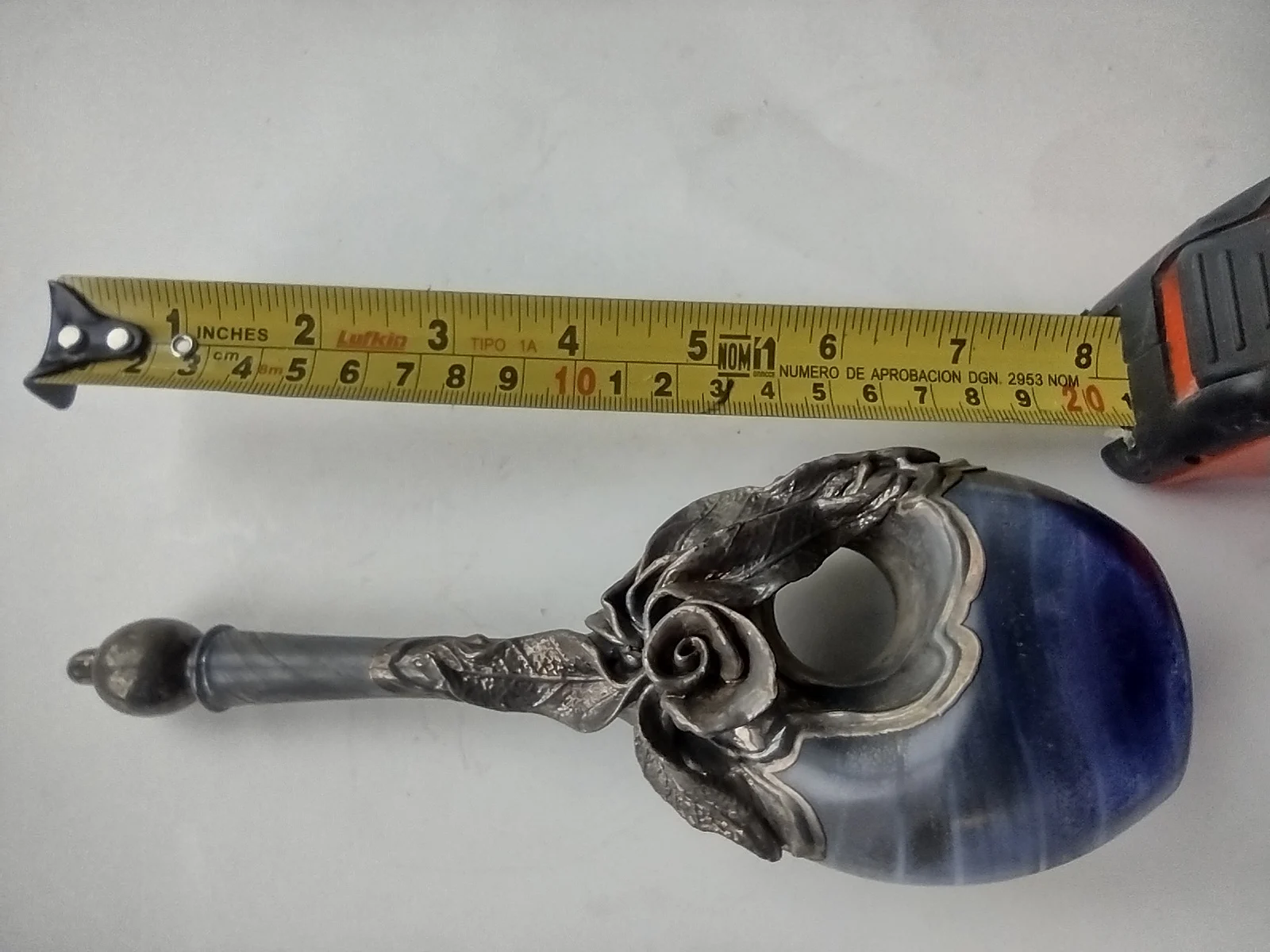 This OOAK (one-of-a-kind) blown glass perfume bottle by Domar of Israel features rich emerald glass and delicate sterling overlay in flowing Art Nouveau style. The matching stopper is also inlaid with silver. A collector’s item with fine craftsmanship and a hallmark of post-war Israeli artisan work.