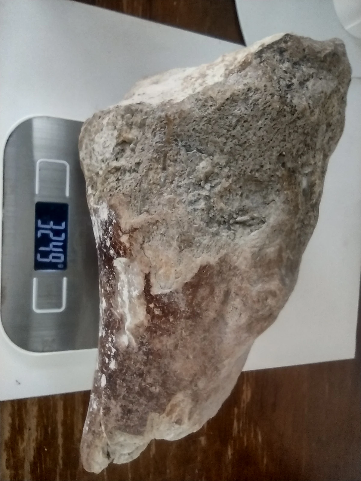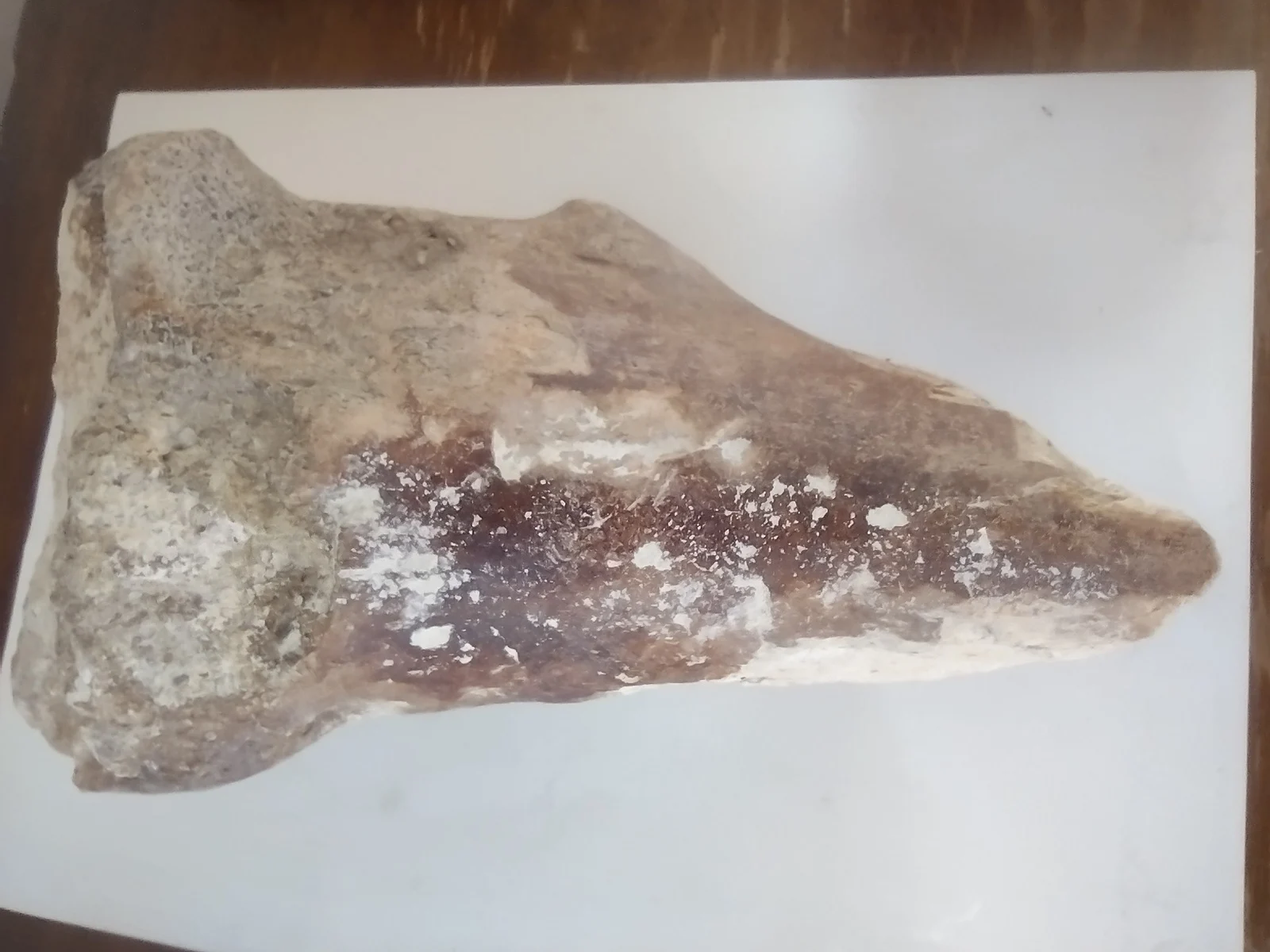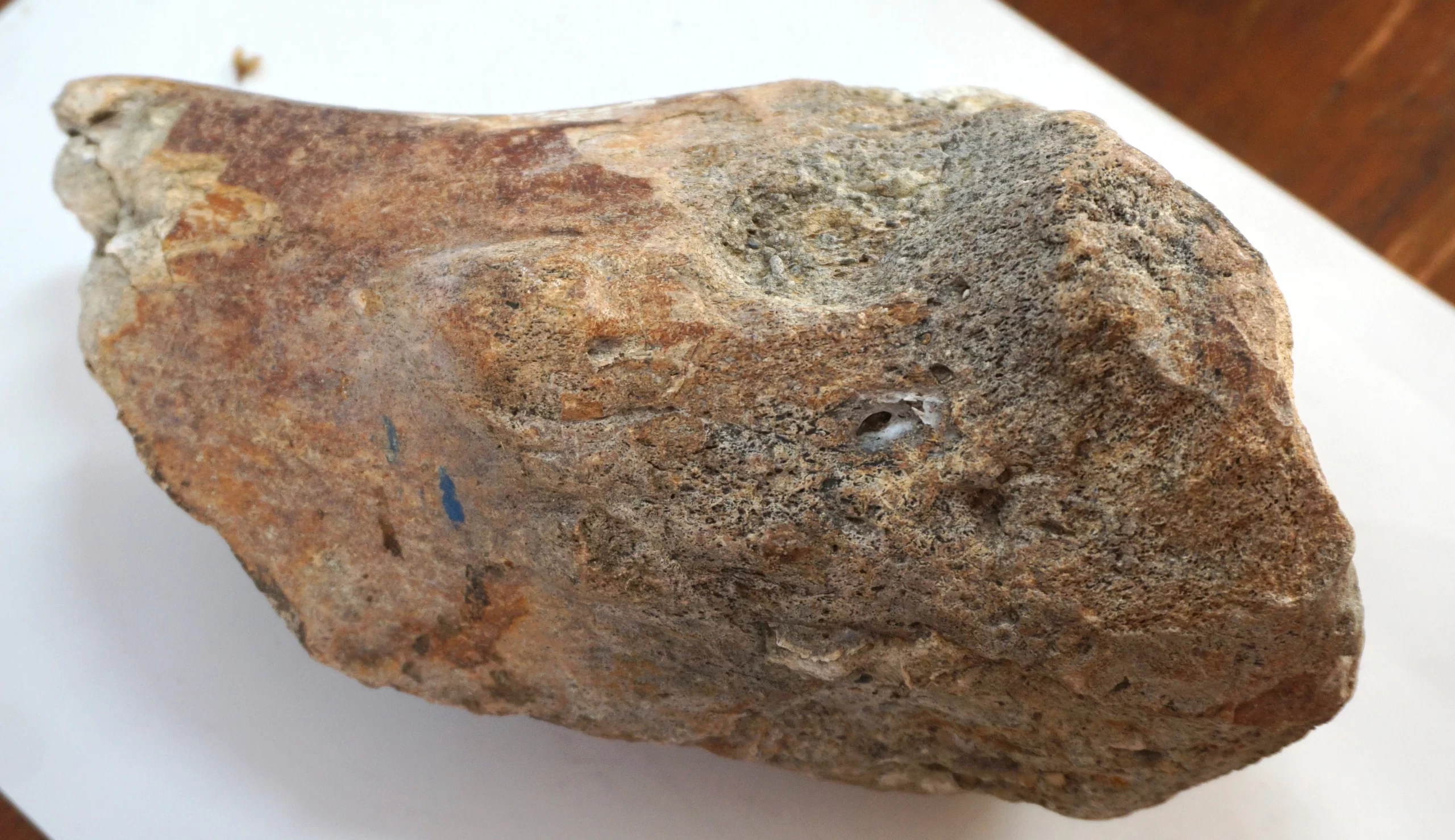 This impressive fossilized bone fragment was discovered in Baja California Sur and exhibits clear signs of mineralization and age, with a mix of dark brown and beige tones. The porous structure and density suggest that it may belong to a large prehistoric vertebrate, possibly a dinosaur or marine reptile. The broad, flattened end and tapered shape could indicate it was part of a limb bone or rib.The fossil weighs over 3 kg and is approximately 24 cm in length. Due to its density, coloration, and preservation, it appears to be authentic and not a modern replica. Identification to a specific species or anatomical position would require further analysis by a paleontologist or natural history expert.A striking piece for any fossil collection, museum display, or educational exhibit.