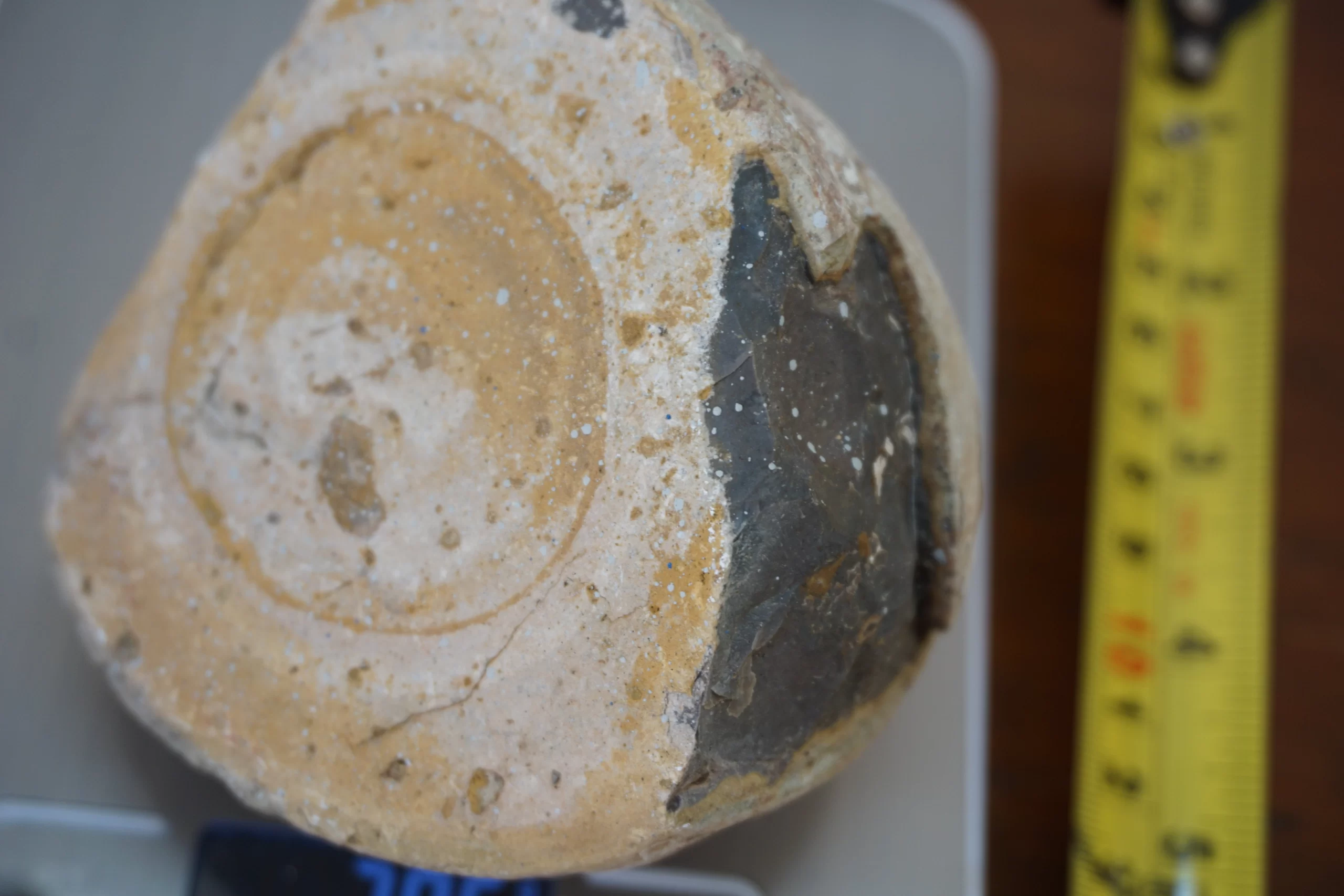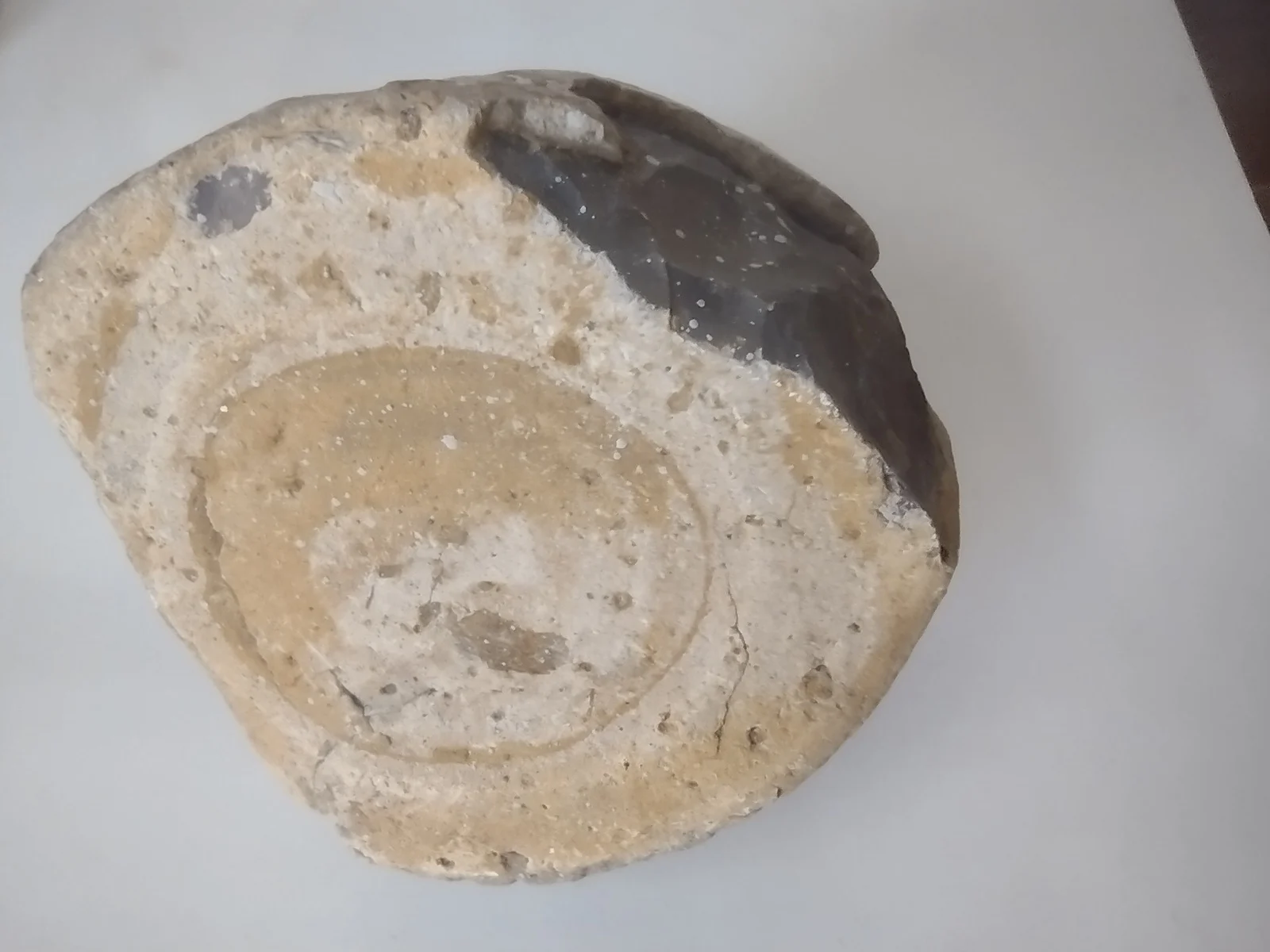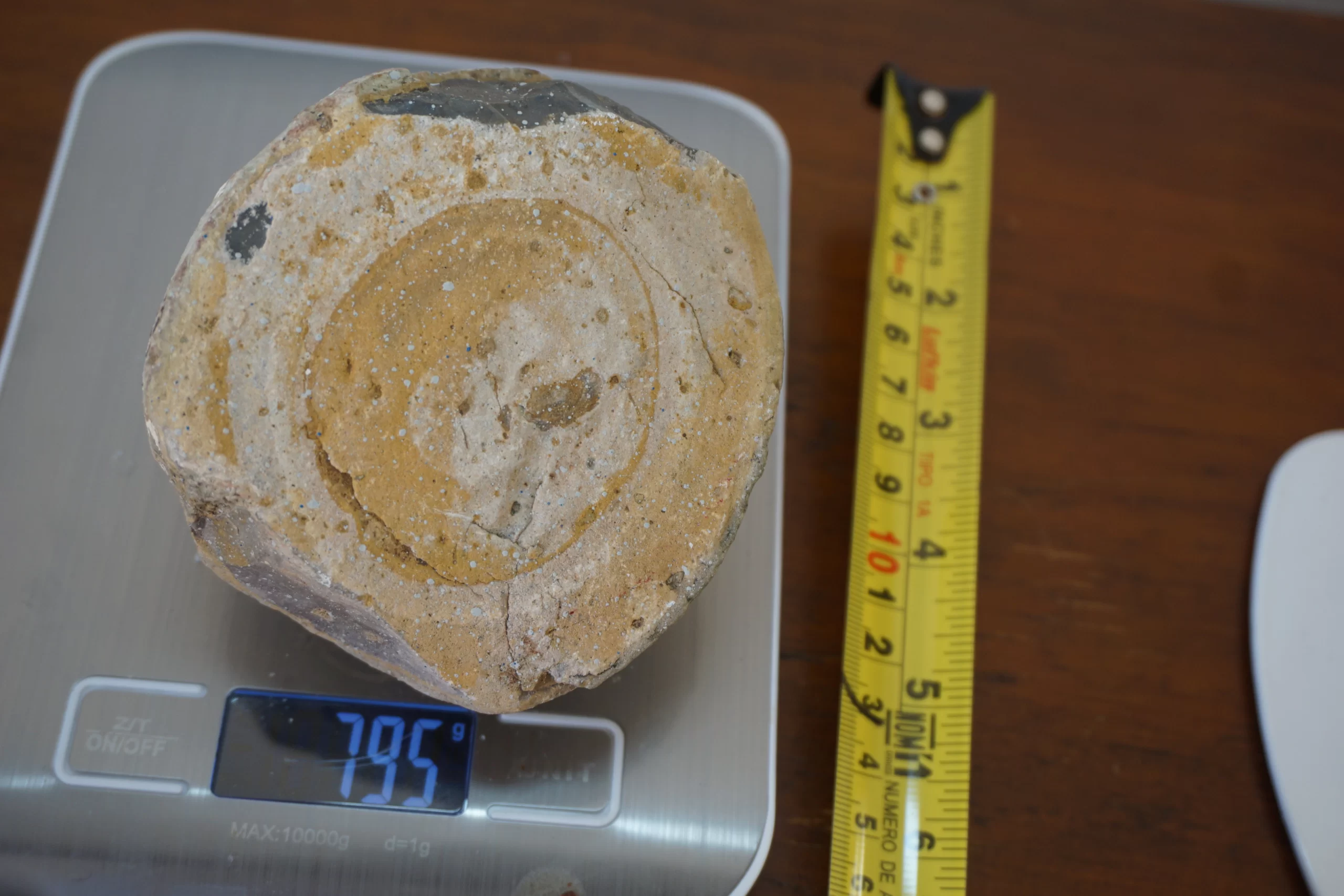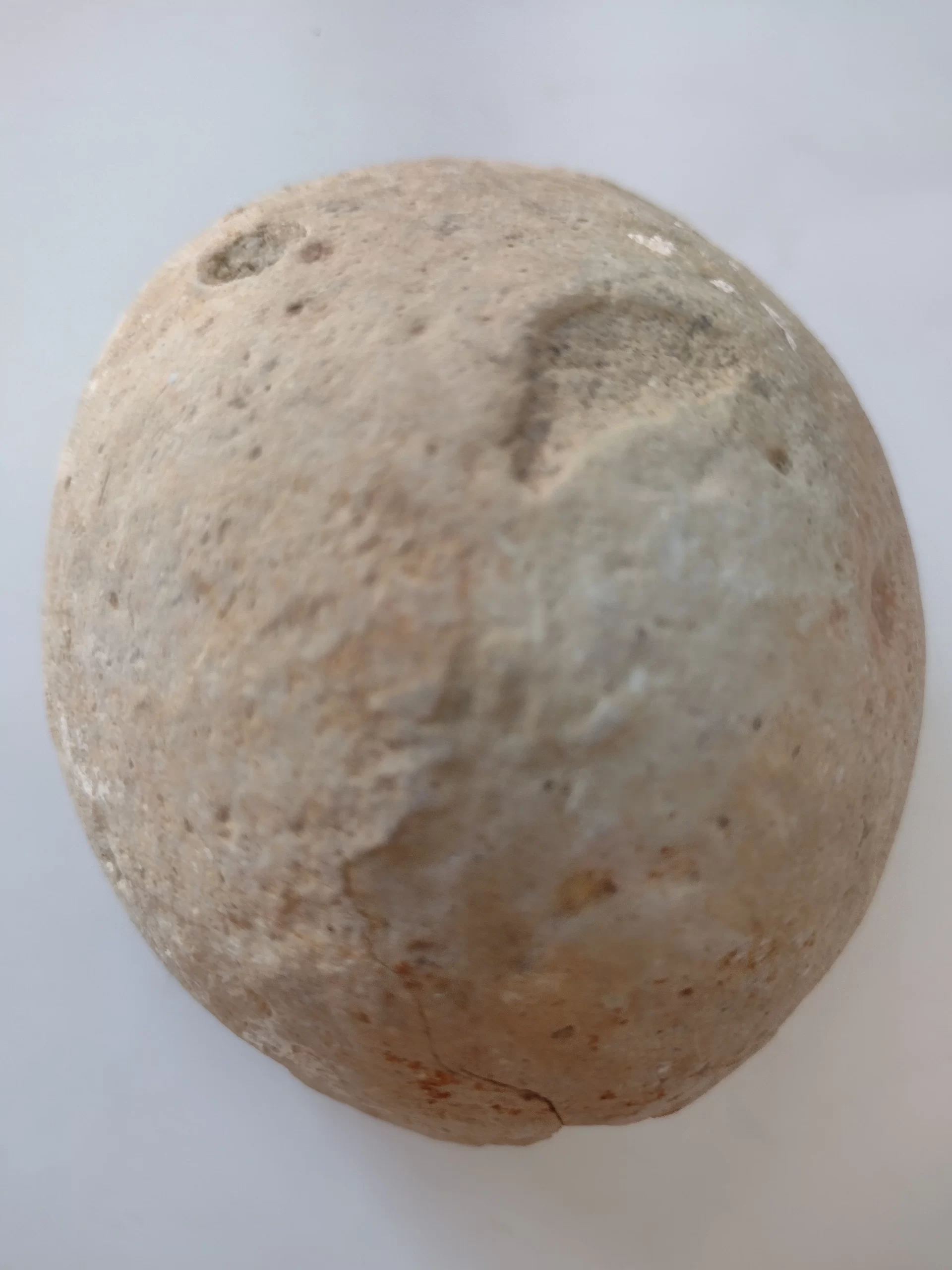 Discovered in Baja California, this ovoid stone exhibits characteristics strongly suggestive of a fossilized dinosaur egg. It features concentric ring-like formations on its flatter end, with a mineral composition indicative of long-term fossilization processes. One side exposes what appears to be chert or flint, a silica-rich mineral often found in fossilized remains. The object’s heavy weight (795 grams), smooth outer texture, and partially fractured side revealing interior mineralization are all traits seen in authenticated fossilized eggs from the Cretaceous period. Though it has not been verified by a paleontologist, the stone's morphology — including egg-like symmetry, sediment coating, and lithified texture — supports this possibility. Such finds are rare in the Baja Peninsula, making it an intriguing candidate for scientific evaluation or collection.