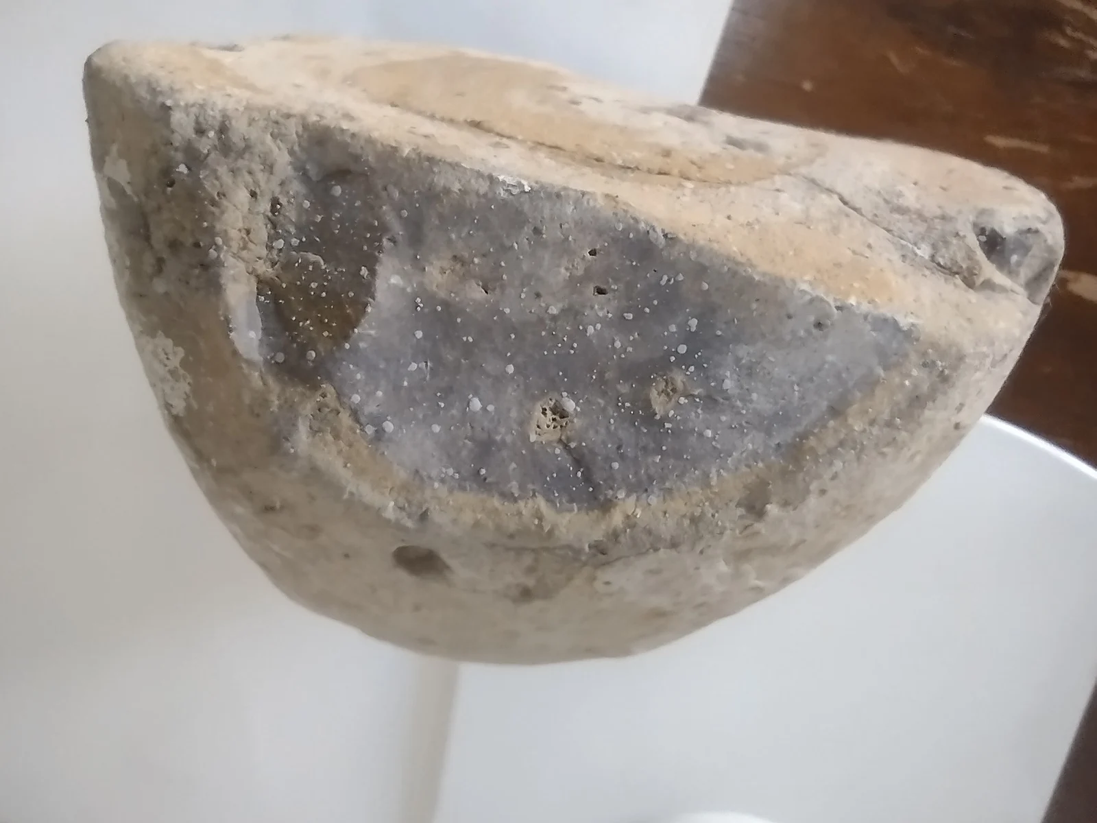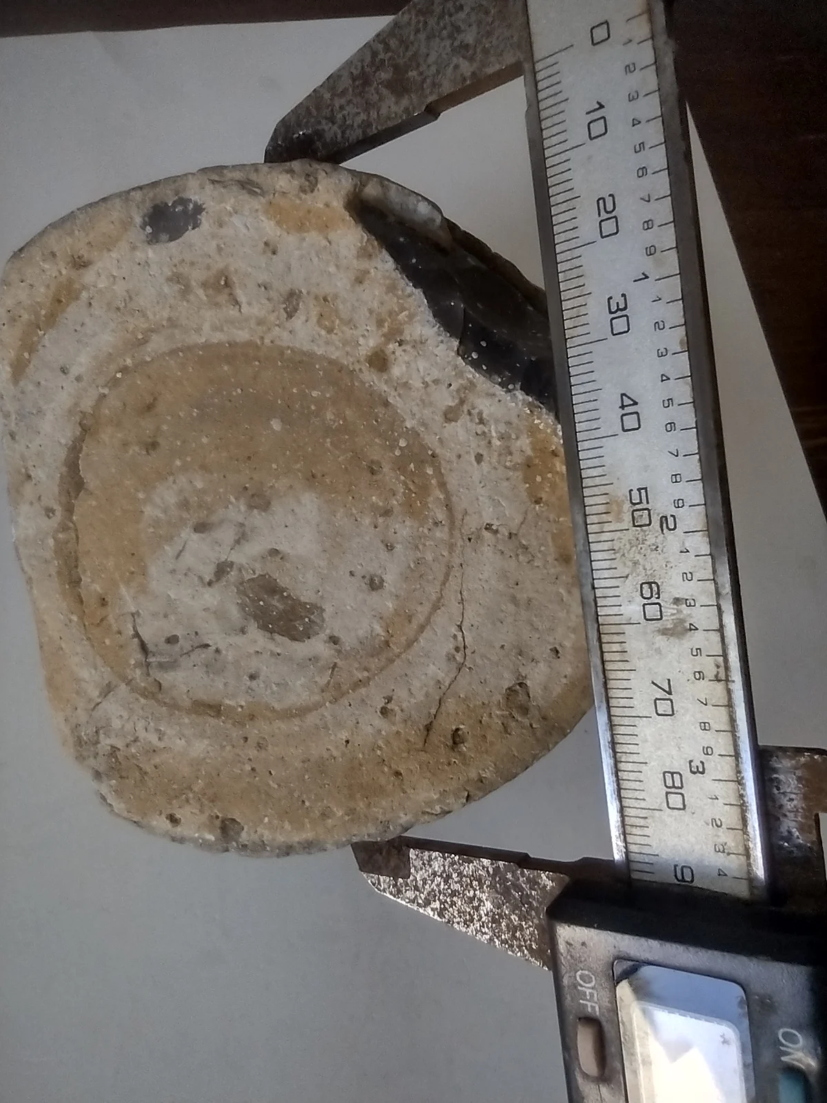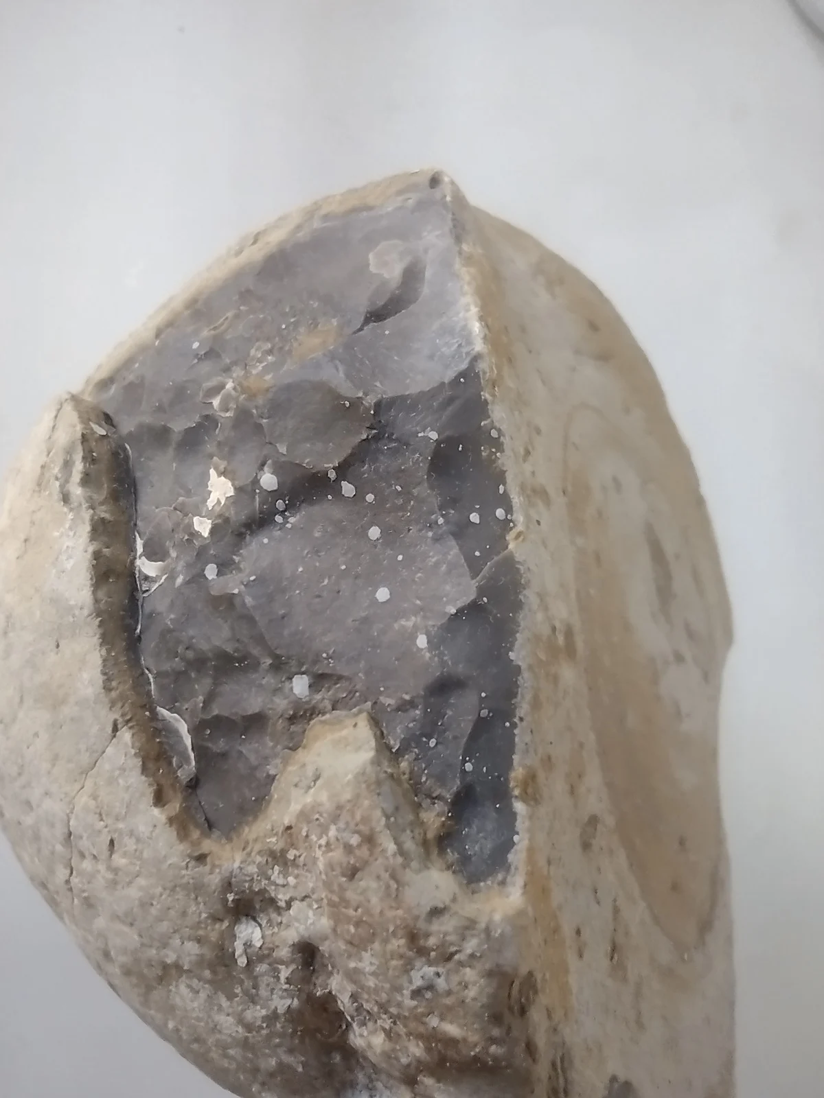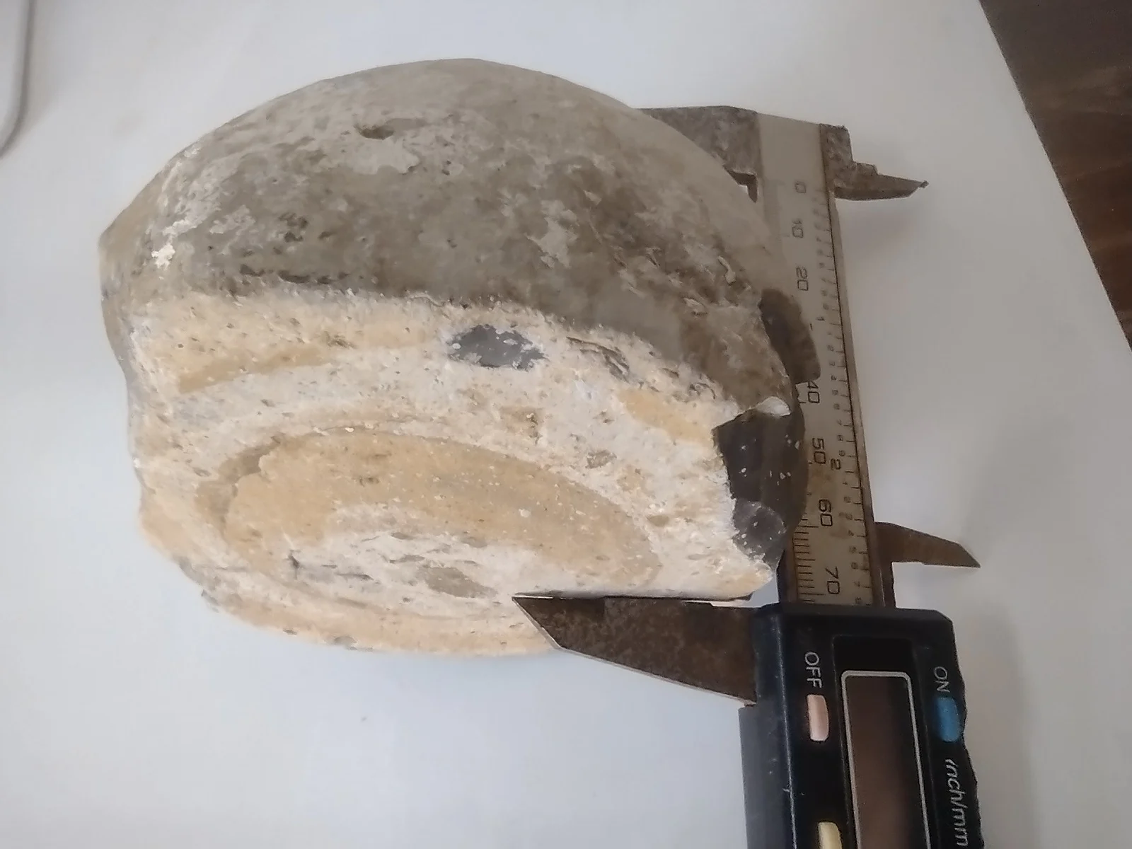 Discovered in Baja California, this ovoid stone exhibits characteristics strongly suggestive of a fossilized dinosaur egg. It features concentric ring-like formations on its flatter end, with a mineral composition indicative of long-term fossilization processes. One side exposes what appears to be chert or flint, a silica-rich mineral often found in fossilized remains. The object’s heavy weight (795 grams), smooth outer texture, and partially fractured side revealing interior mineralization are all traits seen in authenticated fossilized eggs from the Cretaceous period. Though it has not been verified by a paleontologist, the stone's morphology — including egg-like symmetry, sediment coating, and lithified texture — supports this possibility. Such finds are rare in the Baja Peninsula, making it an intriguing candidate for scientific evaluation or collection.