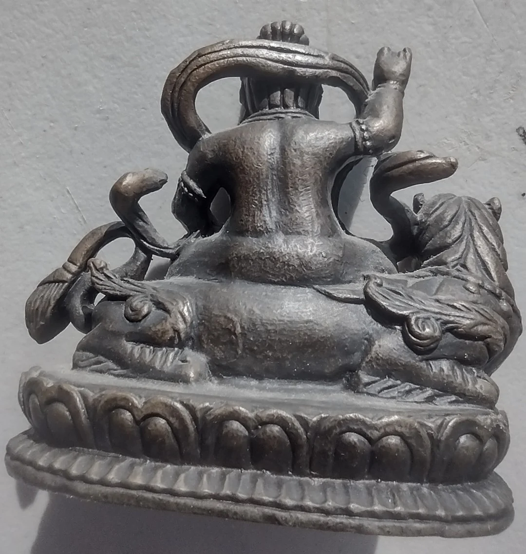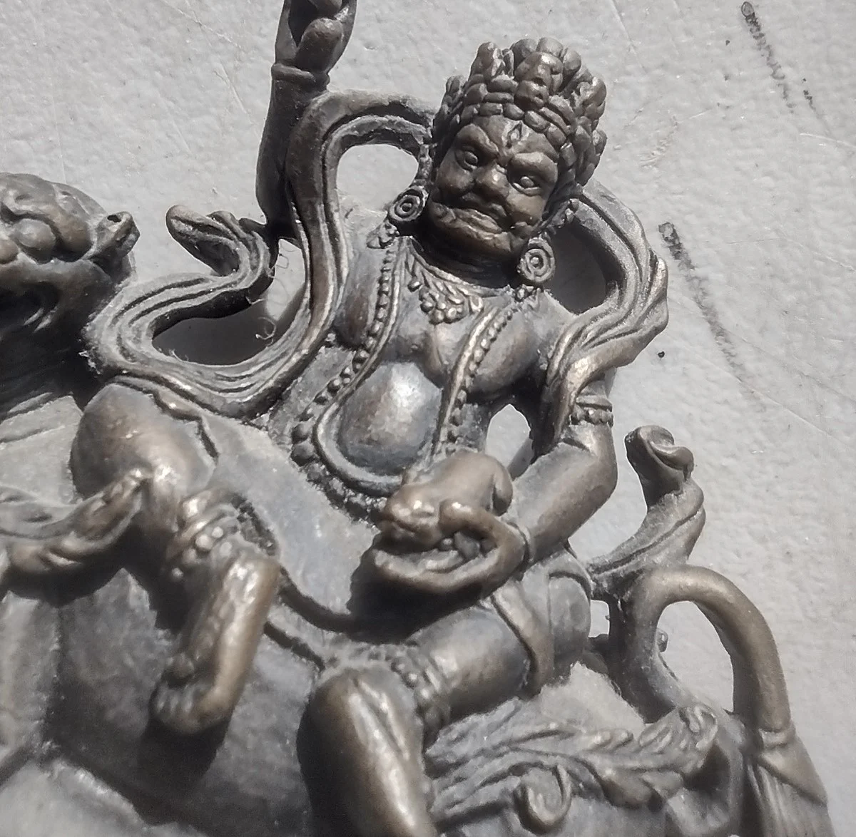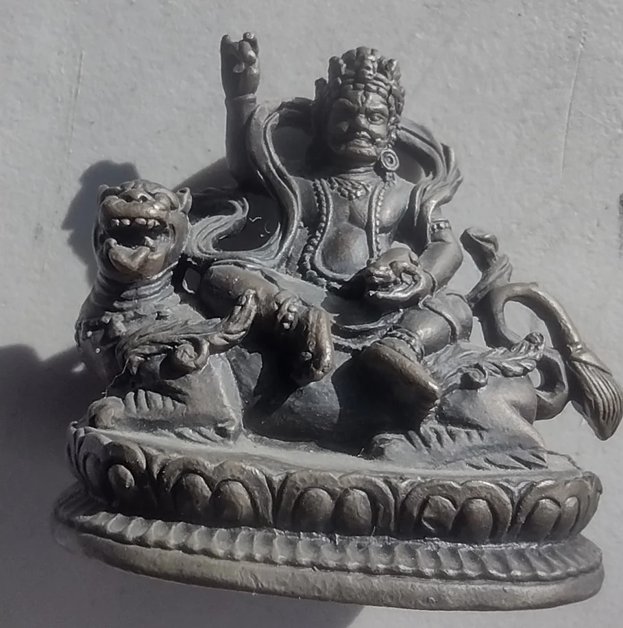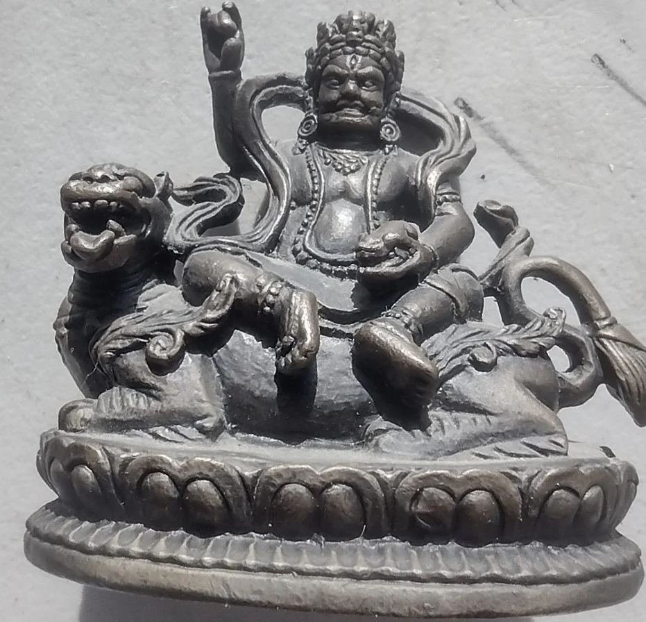 This beautifully detailed bronze sculpture depicts Jambhala (Dzambhala), the Buddhist god of wealth, revered as a protector of prosperity and remover of poverty. With a powerful and fierce expression, Jambhala sits regally upon his lion mount — a symbol of strength and courage. His right hand is raised in a protective mudra, while his left hand holds a mongoose — known in Buddhist iconography for spitting precious jewels, symbolizing the continuous flow of wealth and blessings. The base of the statue is decorated with lotus petal motifs, representing spiritual purity and enlightenment. Crafted with great attention to detail, the figure features flowing ribbons, ornate jewelry, and intricate facial expression. The natural dark bronze patina enhances its character, reflecting age and ritual significance. This piece embodies the spiritual and artistic traditions of Tibetan or Nepalese Buddhism and serves as both a collectible artifact and a powerful symbol of abundance and good fortune. Materials: Solid cast bronze Origin: Himalayan region (Tibet or Nepal) A unique and meaningful piece for collectors of Buddhist art, bronzes, or those drawn to spiritual