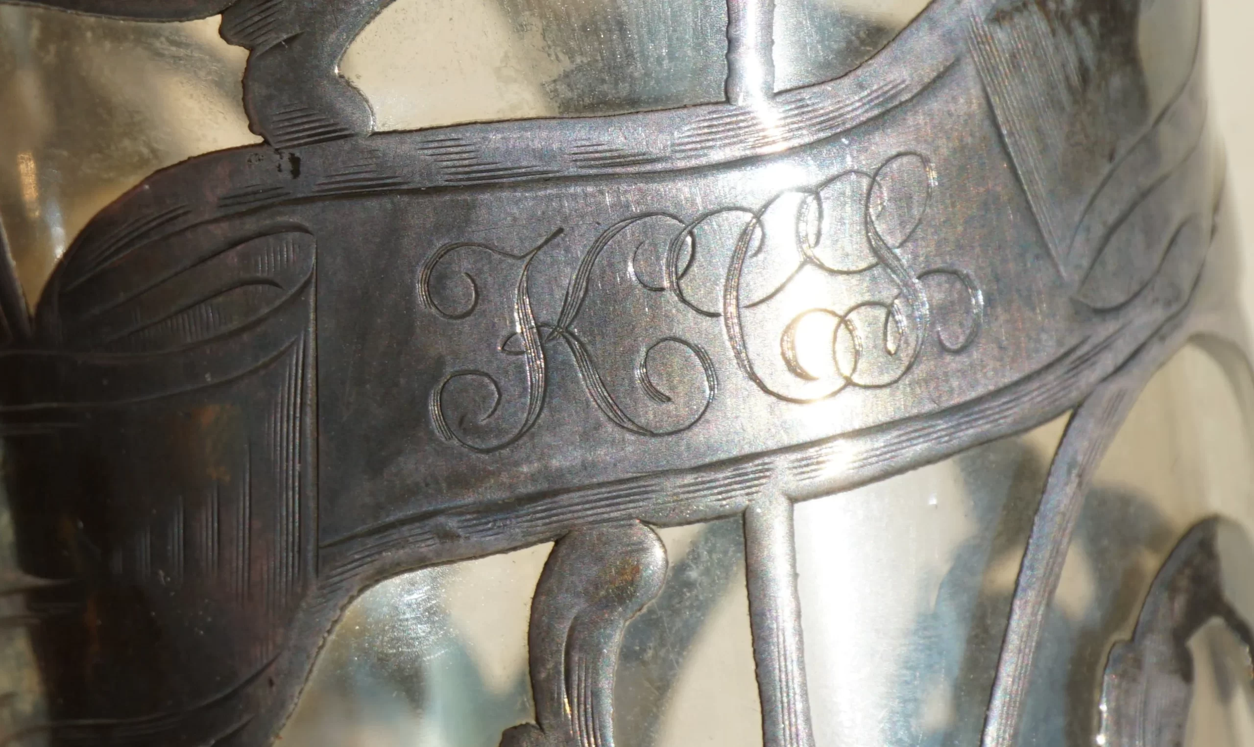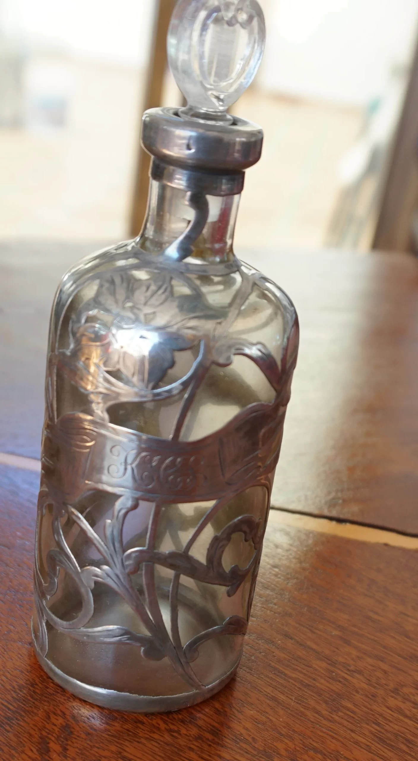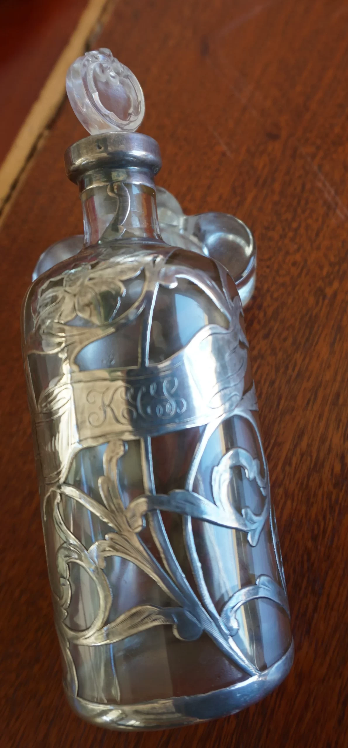 A refined example of Art Nouveau craftsmanship, this perfume bottle features a flowing silver overlay over clear glass, with floral motifs and the monogram 'KCS'. Likely from the late 19th or early 20th century.