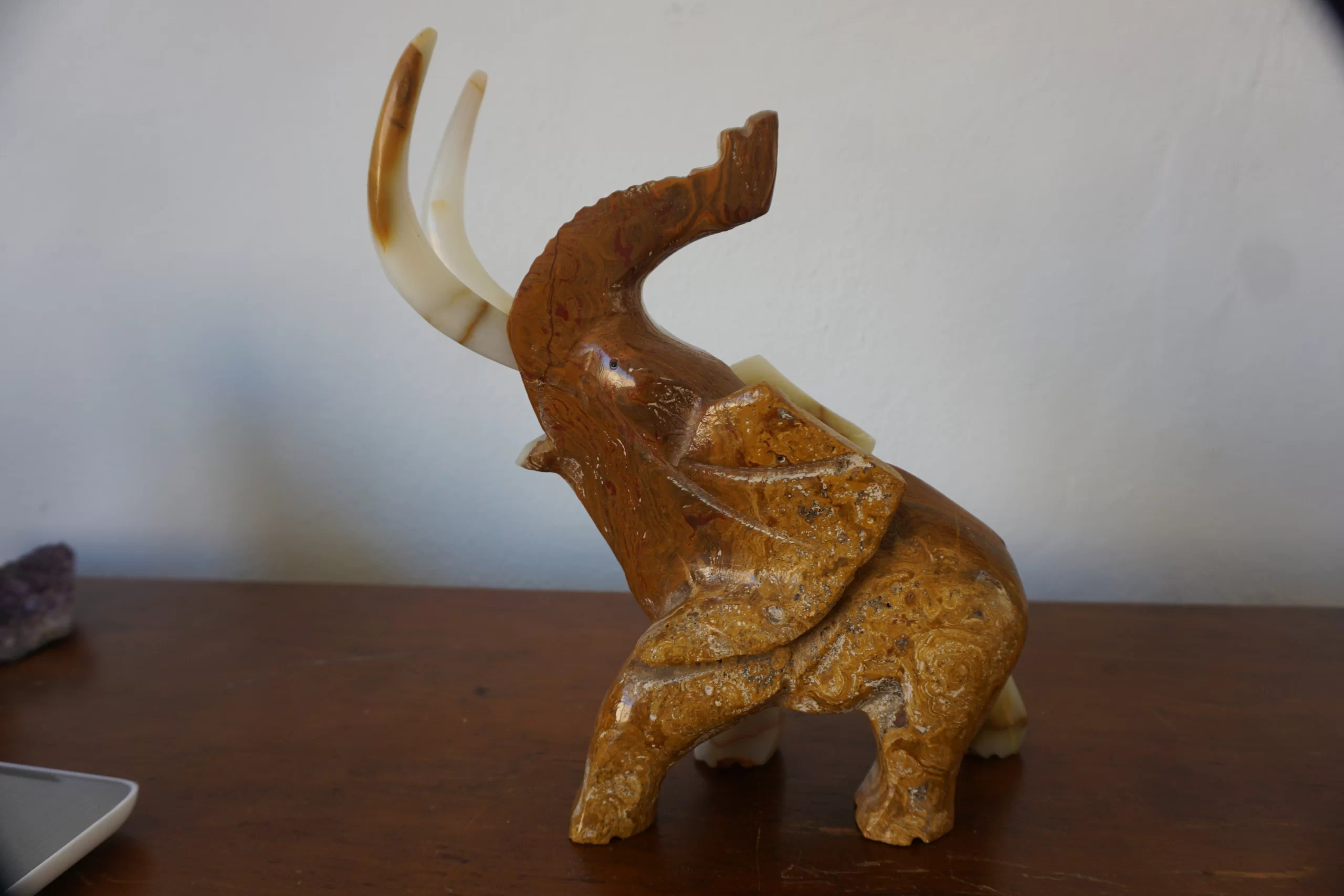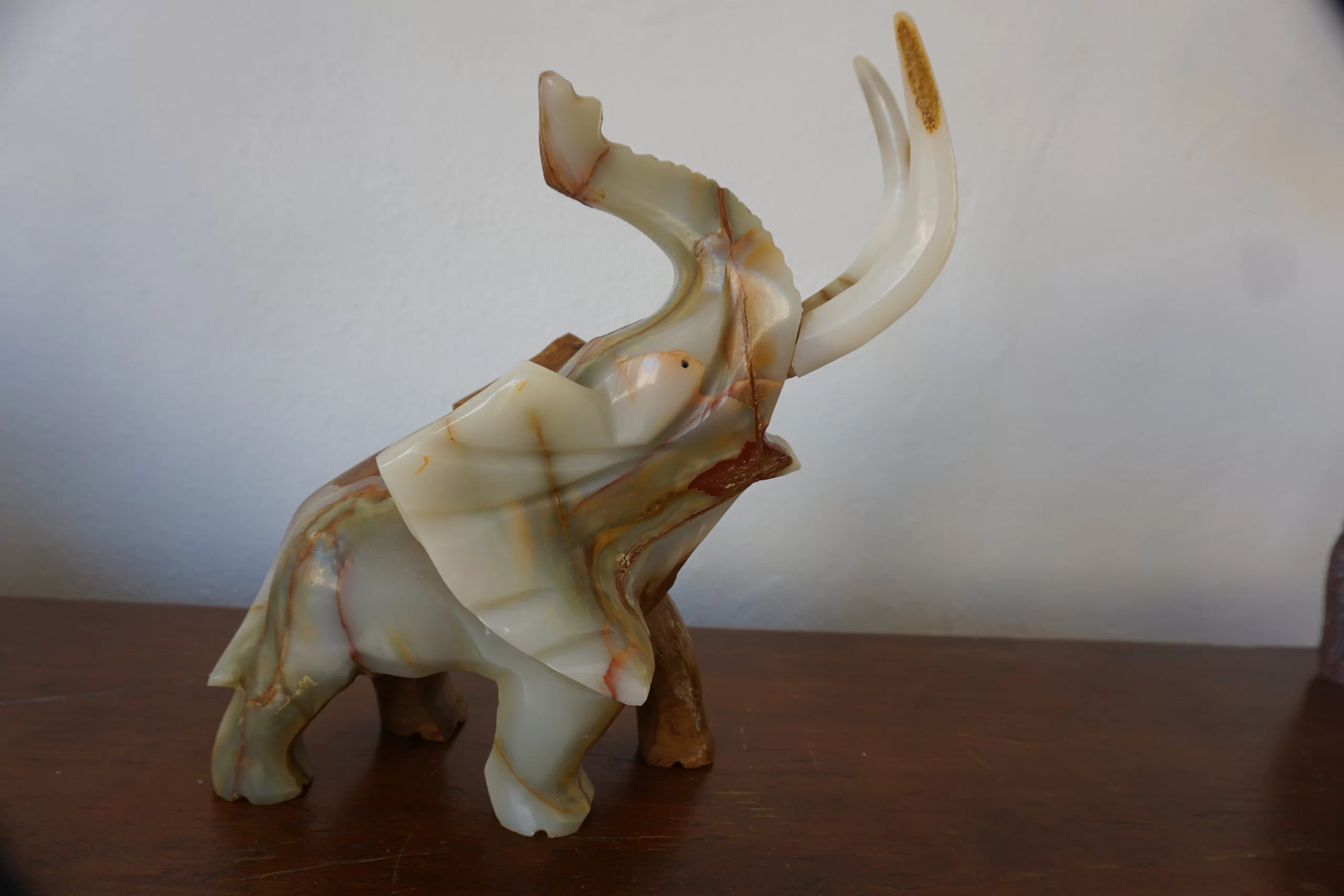 This impressive elephant figurine has been hand-carved from a single piece of multicolored onyx, with natural veins combining brown, white, and amber tones. The onyx horns rise majestically in a gesture of strength and elegance. The sculpture shows great detail in the ears, trunk, and body, with a polished finish that highlights the beauty of the stone. Ideal as a decorative object, a collectible, or a symbolic gift of good fortune and protection.