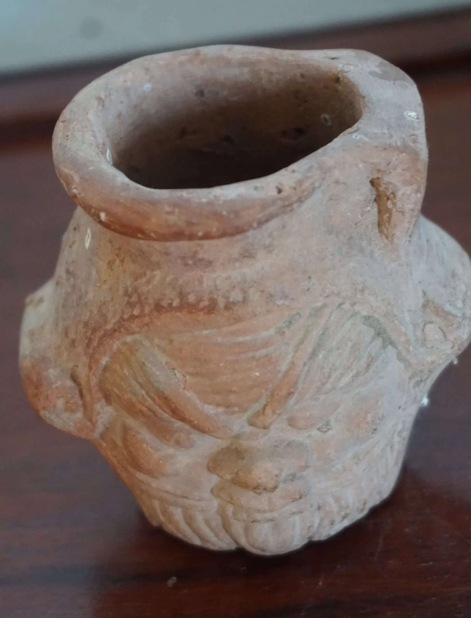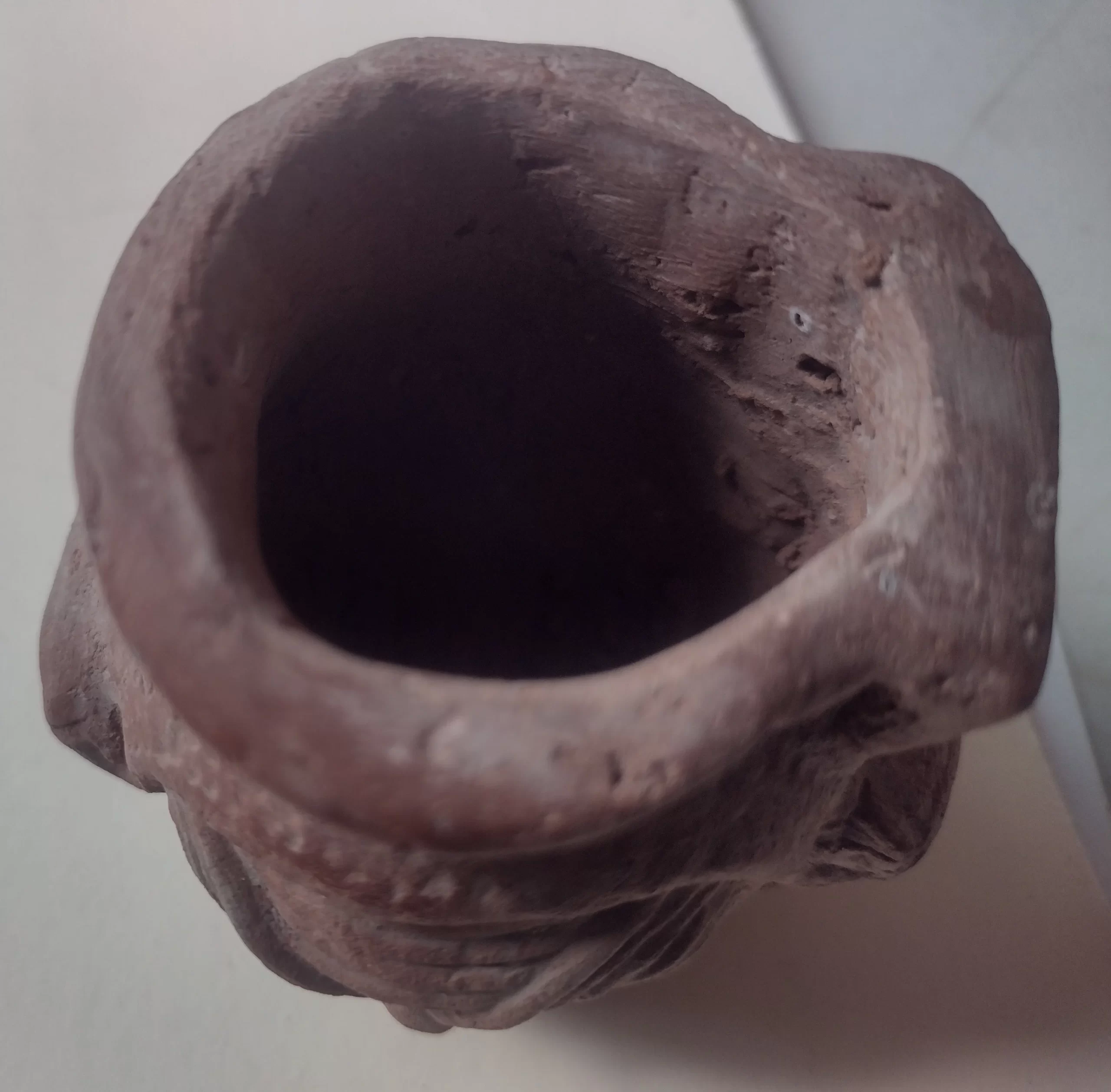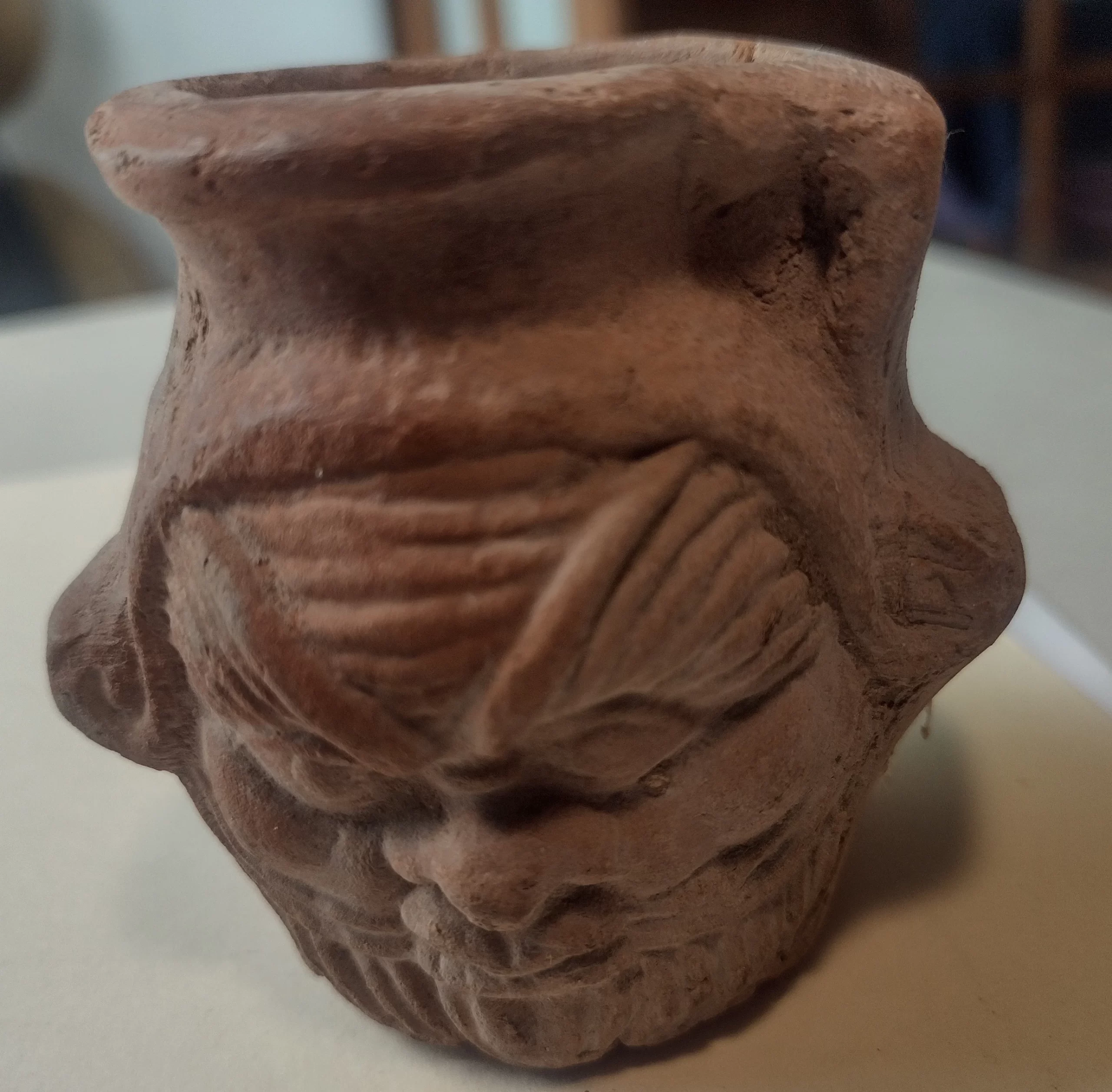 This finely detailed piece shows Bes with a furrowed brow, pronounced nose, and beard—features associated with his role as a protector against evil. The vessel's opening suggests it may have been used in household rituals or as an offering container. Its handcrafted surface and aged patina are consistent with artifacts from the late Egyptian period influenced by Roman culture. Bes was a beloved figure across classes, making this piece a rare glimpse into daily life and beliefs of the time.