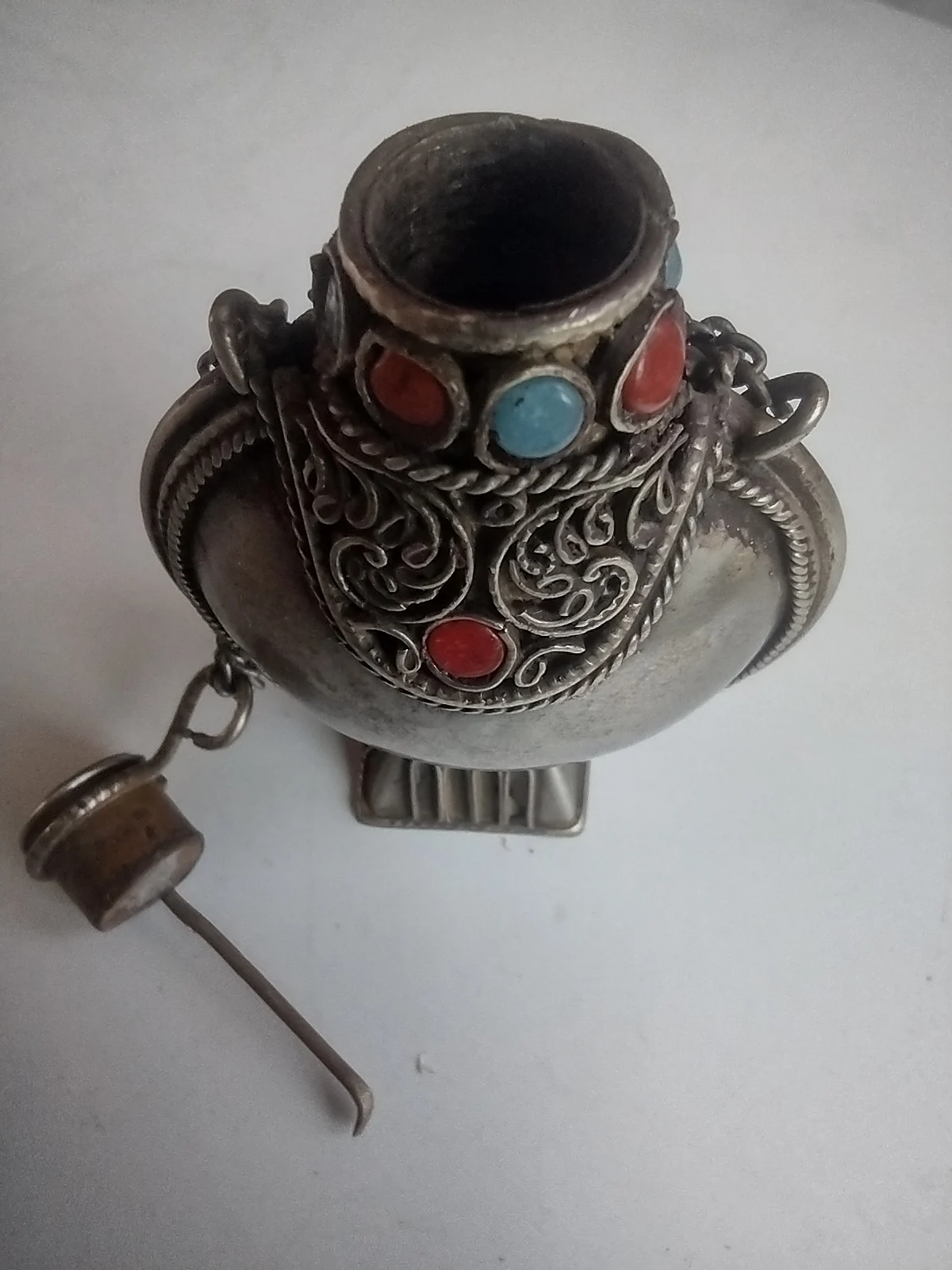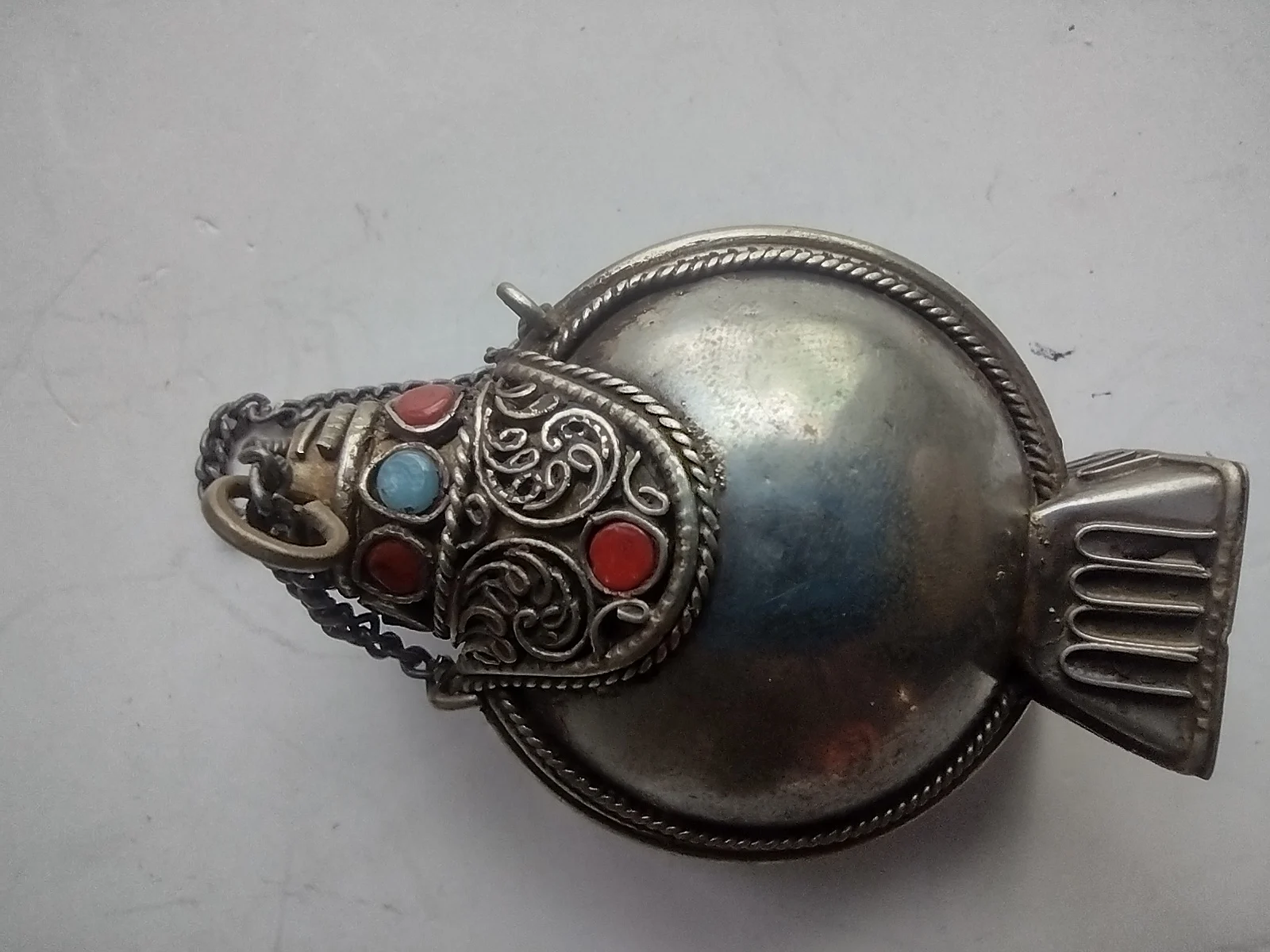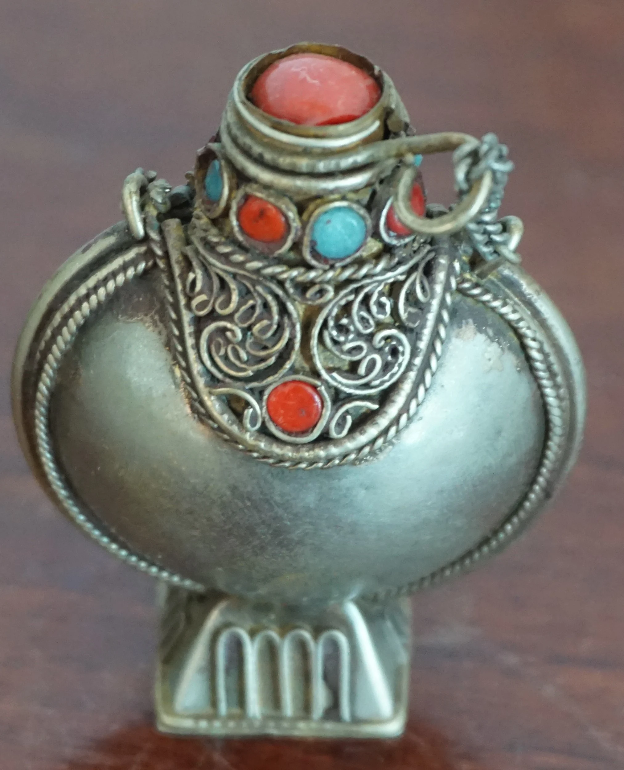 This Ga'u prayer bottle from Tibet is made of silver with filigree panels set with red coral and turquoise cabochons. Traditionally used to carry sacred herbs or relics.