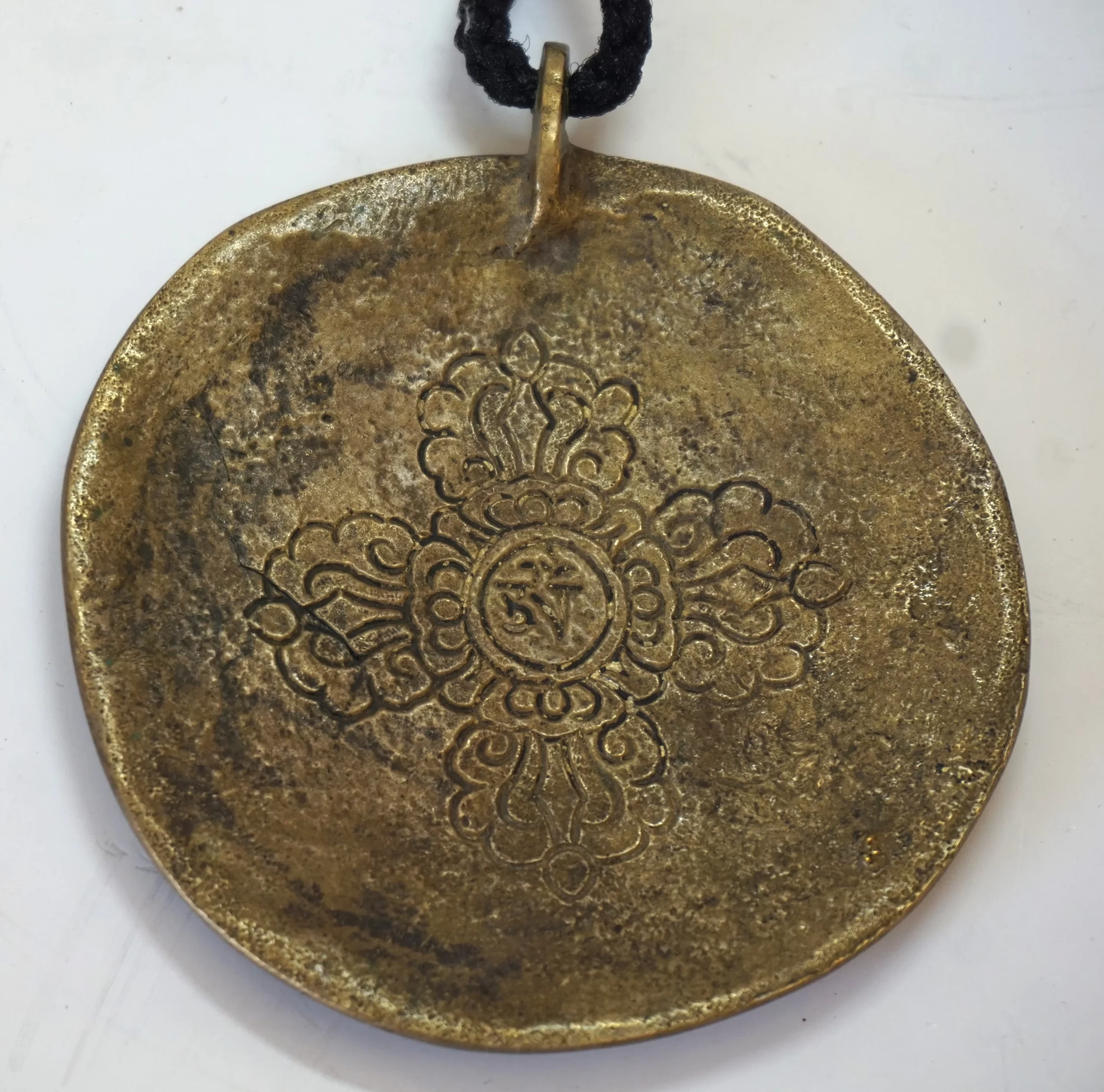 Tibetan Bronze Medallion Amulet. This intricately cast Tibetan bronze medallion features a detailed depiction of the Tibetan astrological calendar, surrounded by symbolic flames representing spiritual energy. The central motif displays the "Kalachakra" symbol, embodying the Wheel of Time and cosmic order. The reverse side is engraved with a traditional double dorje (vajra), symbolizing stability, protection, and the indestructible nature of enlightenment. Worn as a protective amulet, this piece reflects the rich spiritual and artistic heritage of Tibetan culture. Material: Bronze - Origin: Tibet - Period: 19th-20th century (estimated)